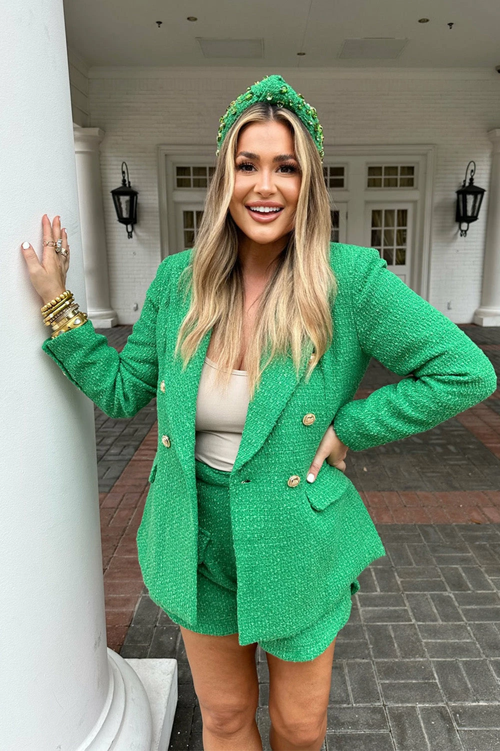 Pair her with our matching Tucker Blazer and Mae Shorts in green tweed for you new favorite outfit!