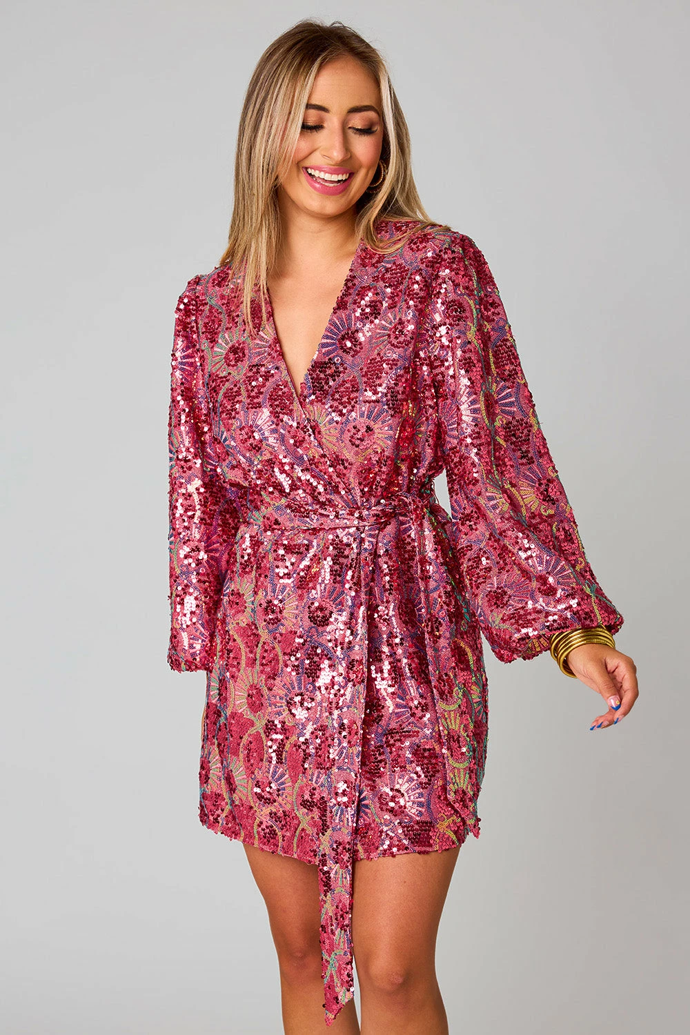 Style and comfort is our priority going into the holiday season and this wrap dress is just that! The loose fit, wrap waist, and mid-thigh length allows you to be comfortable for your entire event and looking great while partying the night away! Pair with a bright color heel to accent the dress!