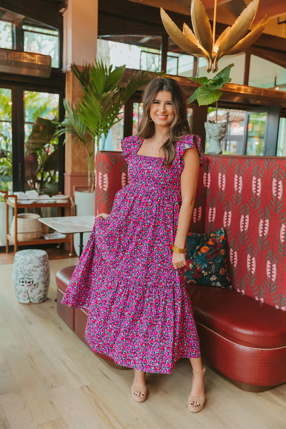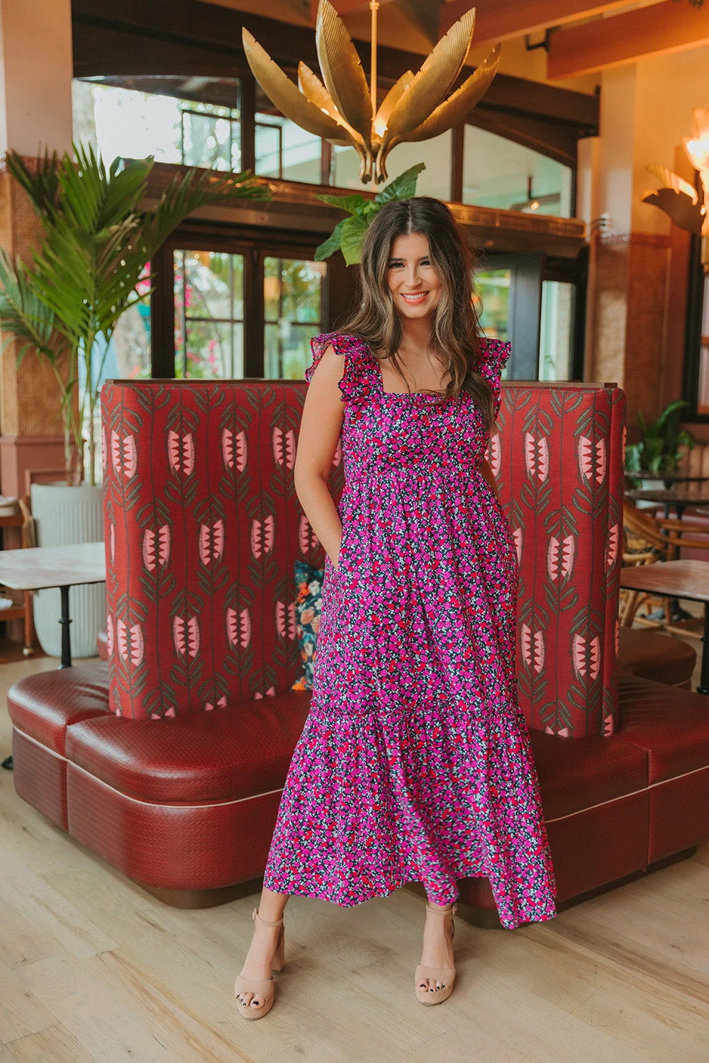 Ready to explore the world? This brightly colored ruffle shoulder midi dress will have you feeling confident through any adventure. It has pockets, a ruffle sleeve and a smocked panel in the back for comfort! The midi length means you can show off your cute shoes and you’ll be ready just in time for summer vacay!