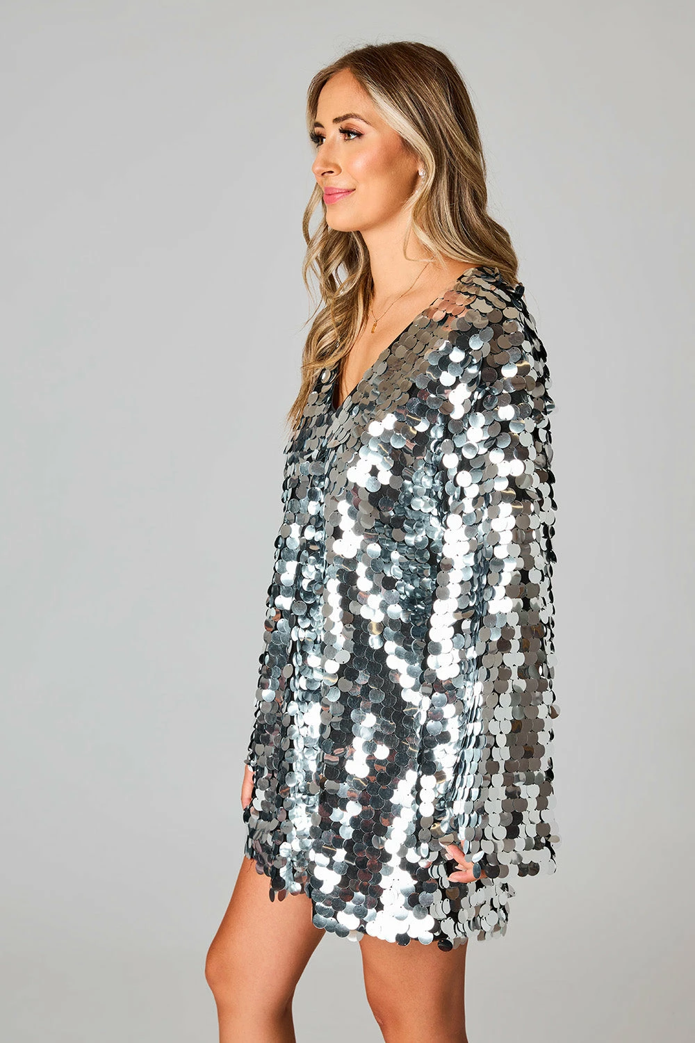 Shine like a mirrorball in our new Bertie Dress! Our Bertie Dress features a v-neck shift dress silhouette, long bell sleeves, disco sequins, a bra friendly bodice and is fully lined! She’s perfect for all your holiday parties this season!