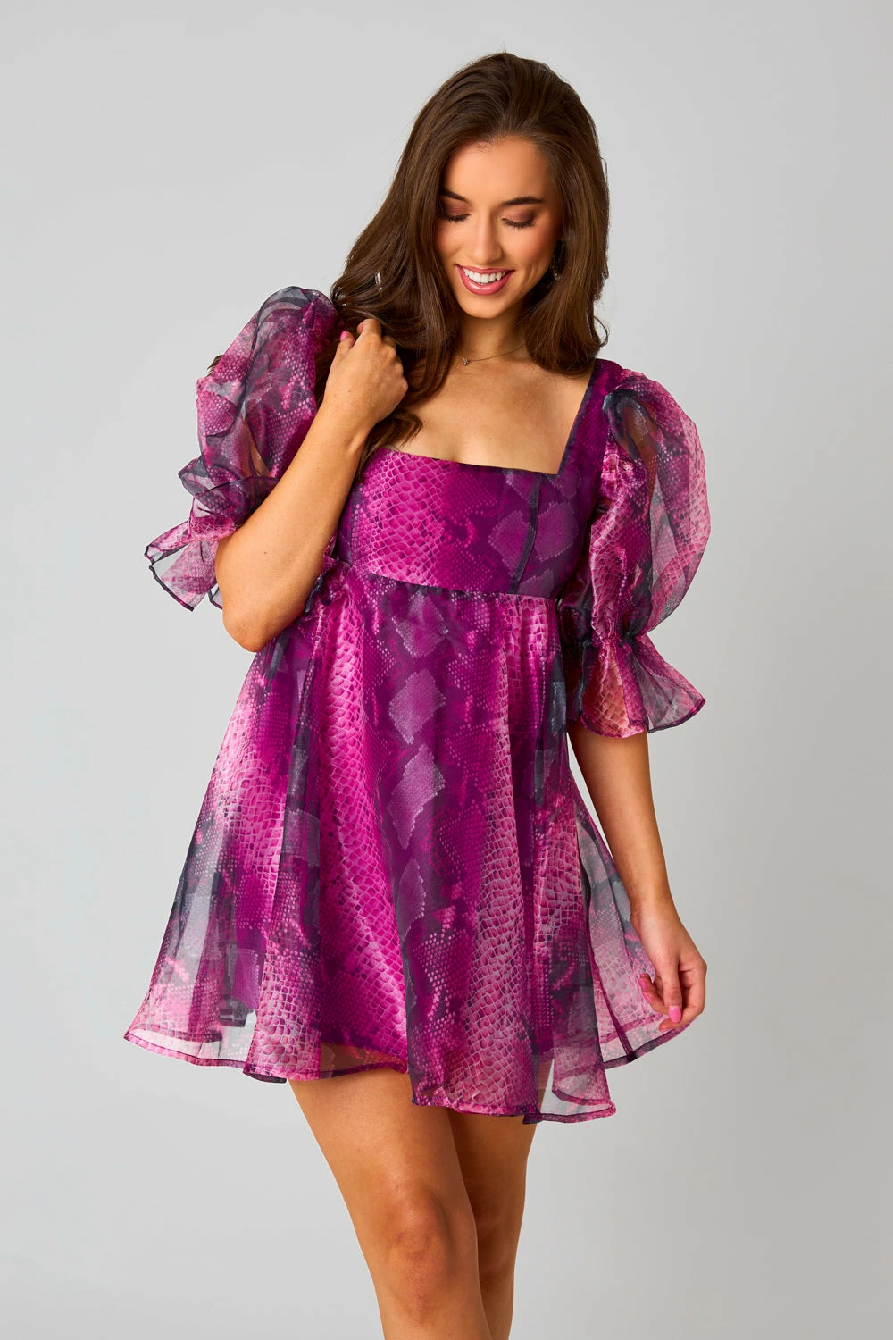 All the heart eyes for our Betsy Puff Sleeve Babydoll Dress! This Magenta snakeskin print is perfect for a night out or any place you want to make a statement with your outfit this fall! Dress it up with a pair of black velvet heels or dress it down with a staple pair of booties.