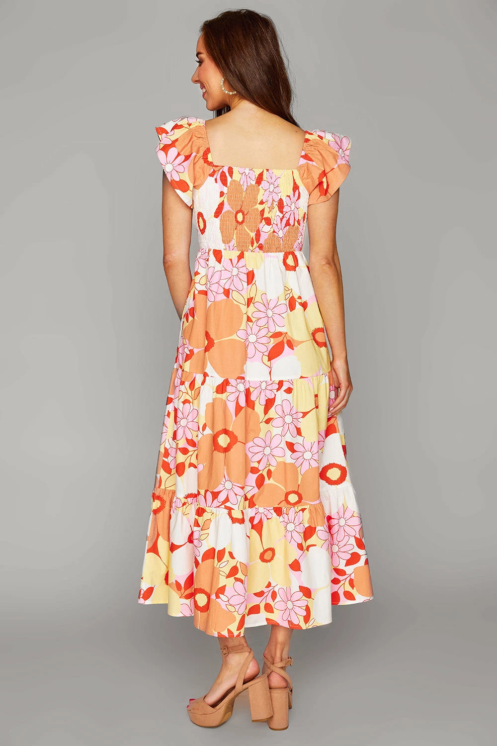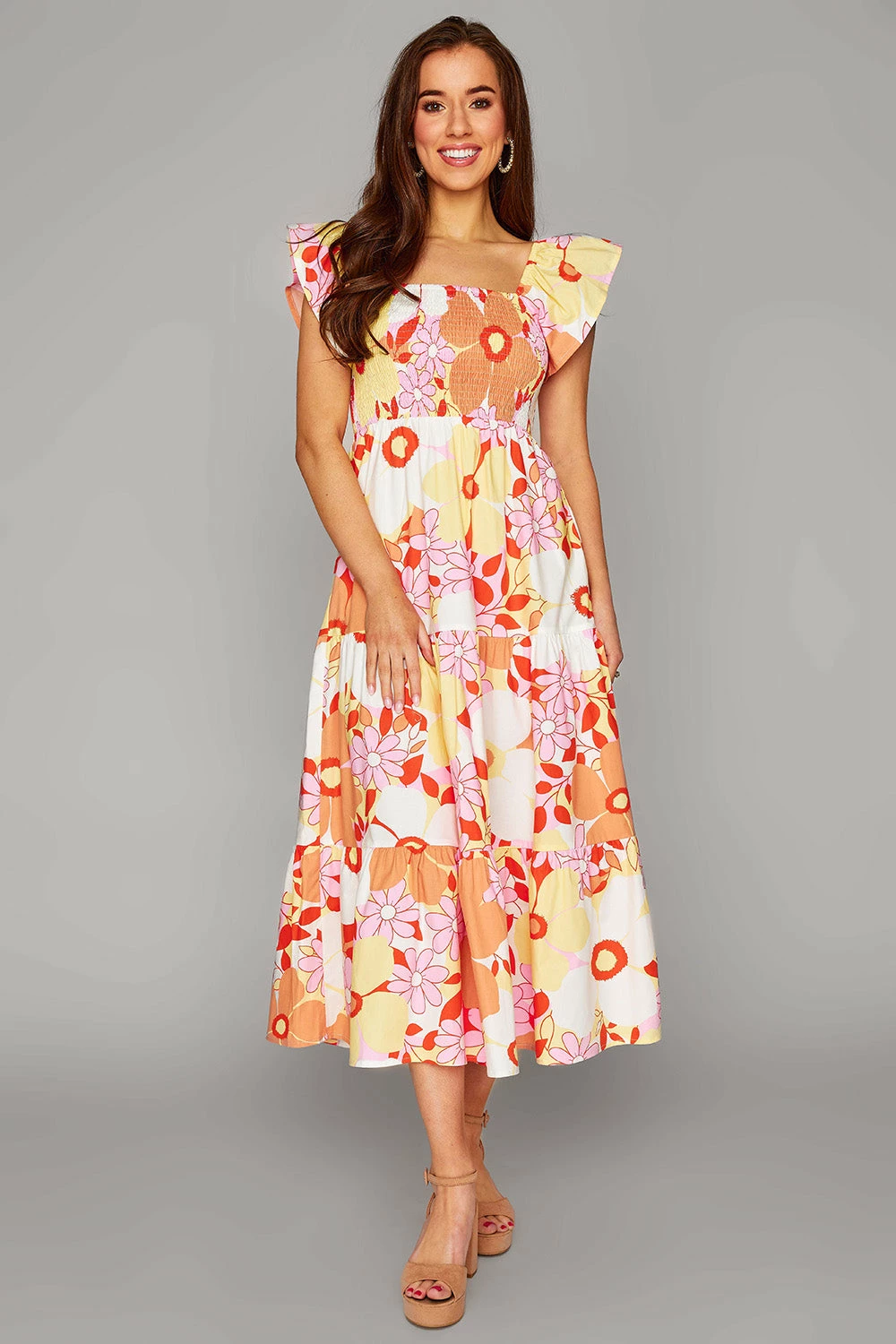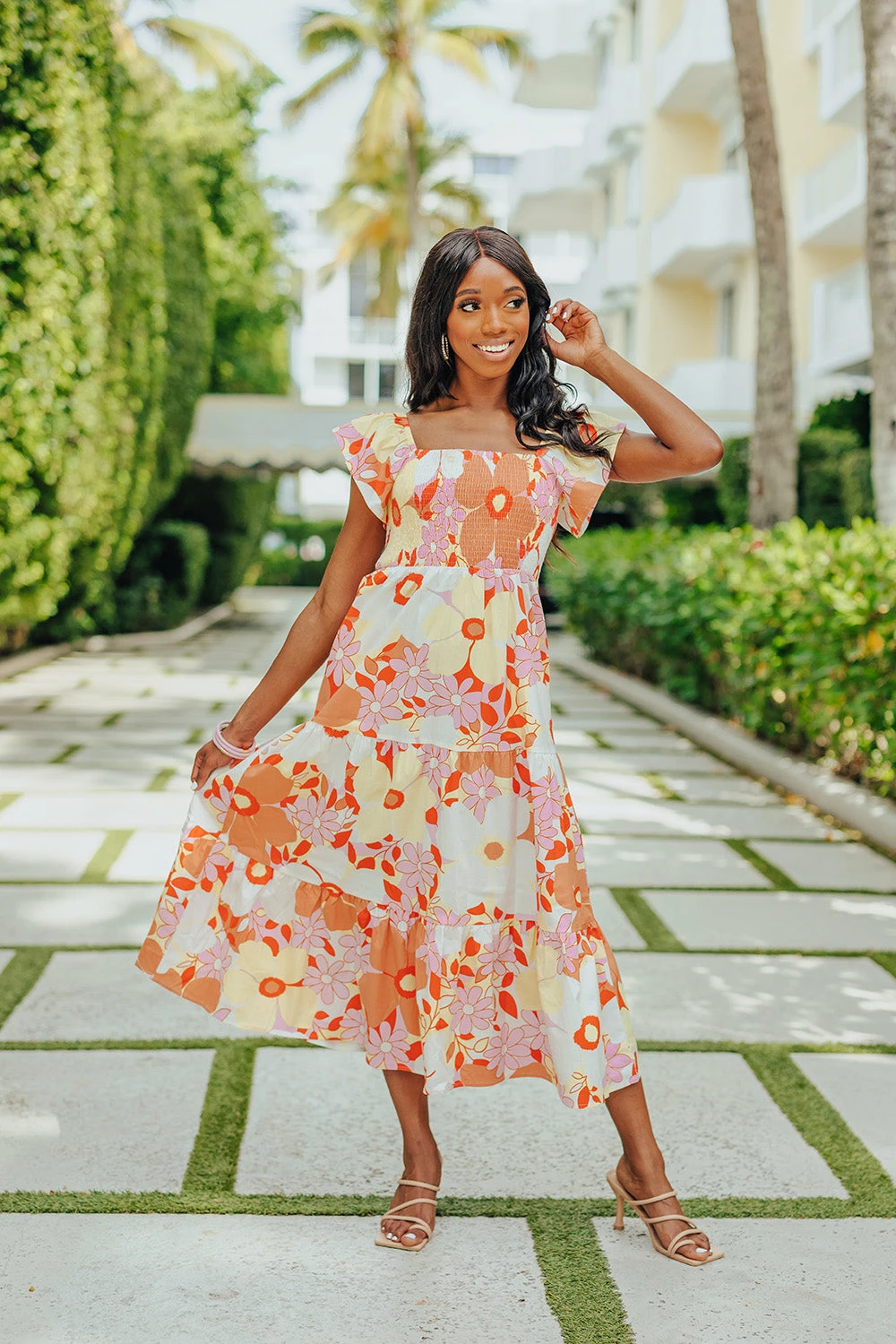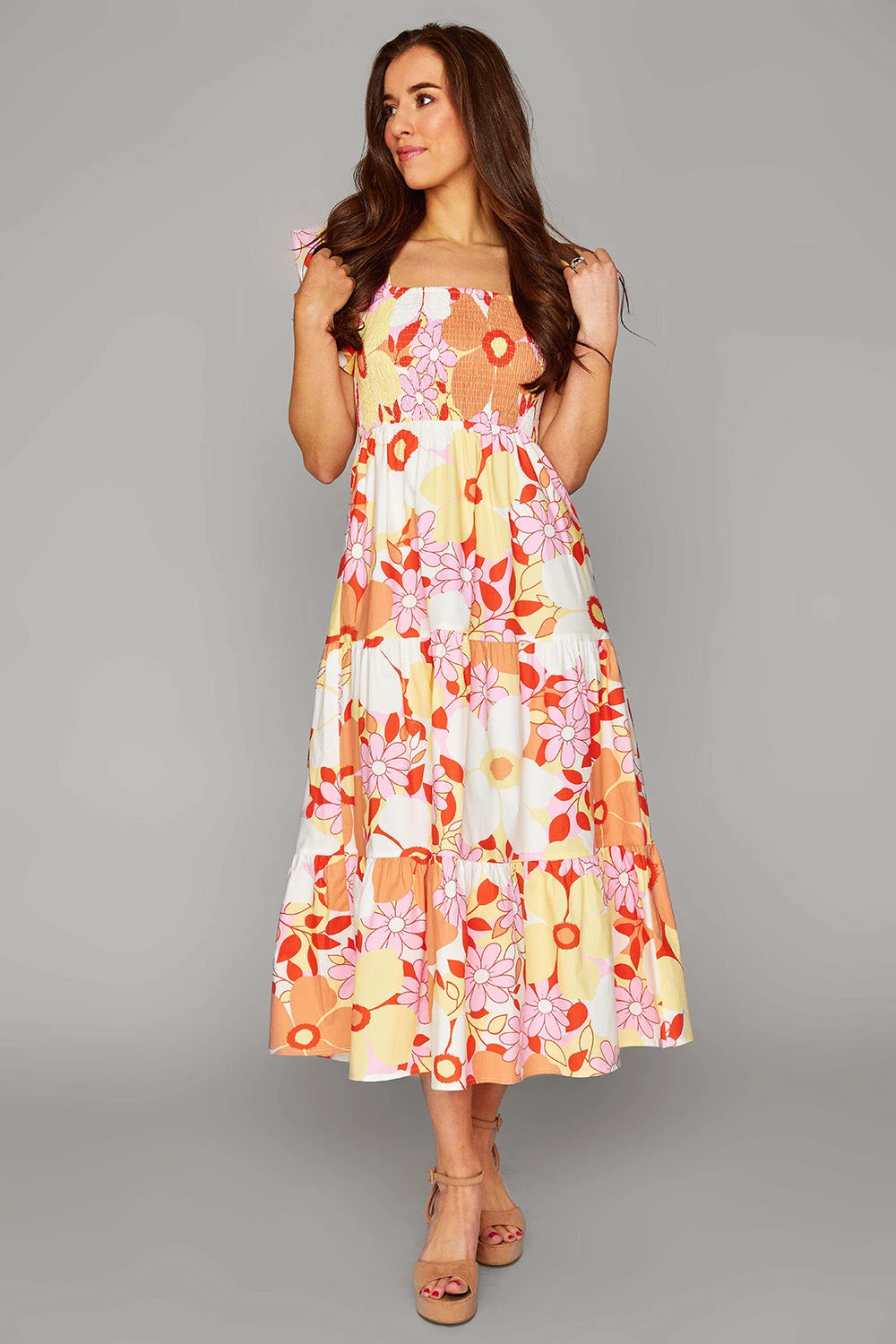 The Brynn will be your new fav dress! She features ruffle sleeves, smocking all across the chest, tiered layers on the skirt, and midi length. Pair with wedges, a fun summer bag, and statement jewelry!