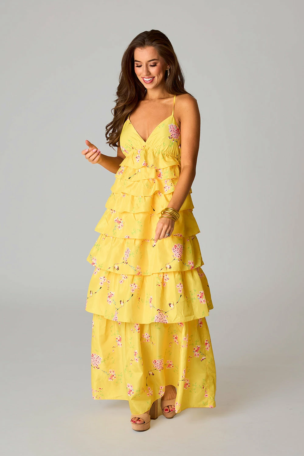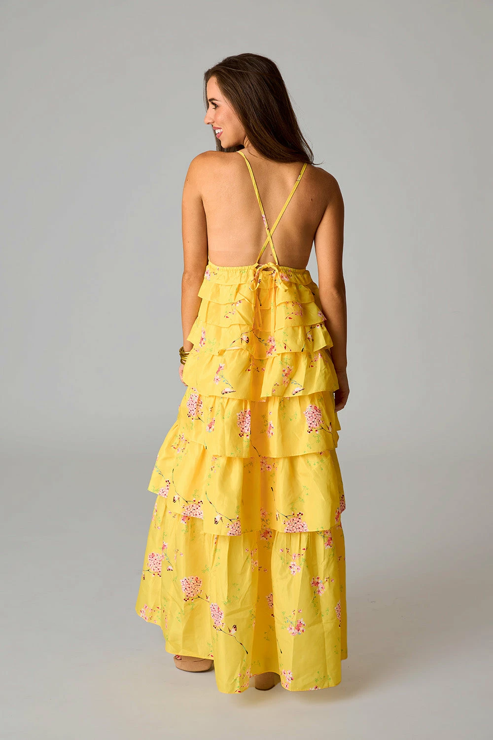 If sunshine were a dress, this one would be it! Her straps cross in the back with a tie to adjust to your comfort. The v-neck and ruffled tiers make her fun and flirty! This Callie Maxi is a must have for all this seasons events.