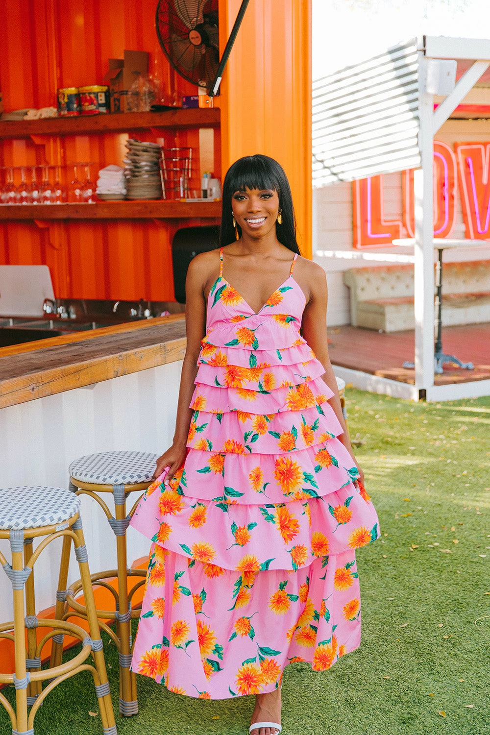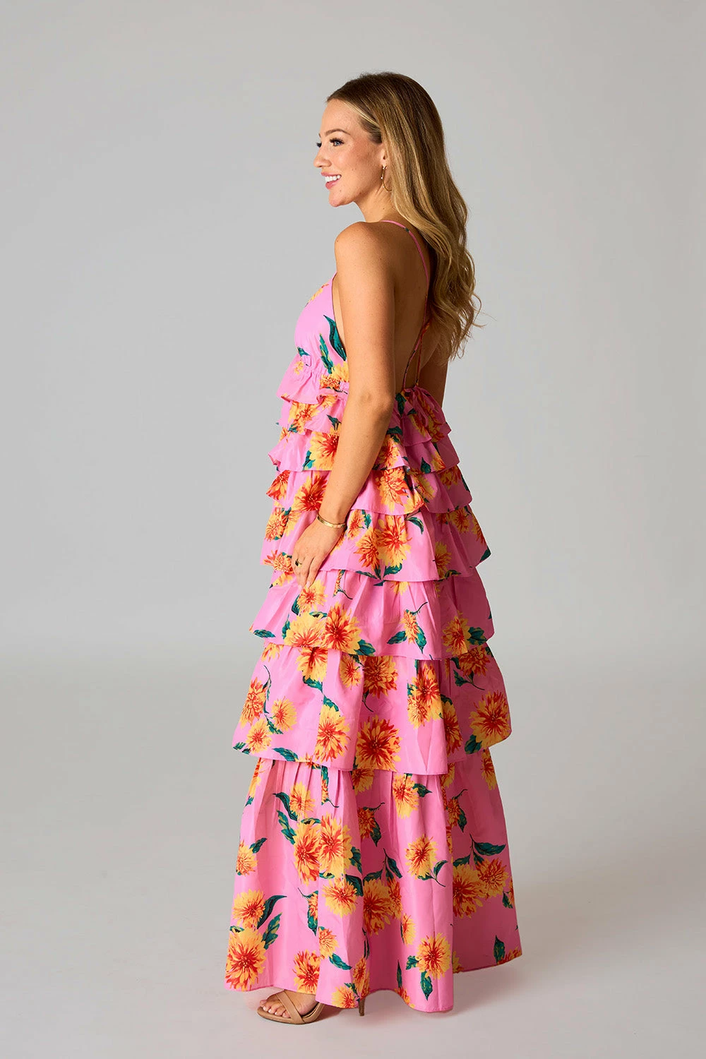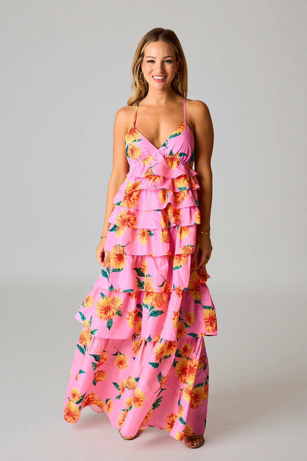 If sunshine were a dress, this one would be it! Her straps cross in the back with a tie to adjust to your comfort. The v-neck and ruffled tiers make her fun and flirty! This Callie Maxi is a must have for all this seasons events.