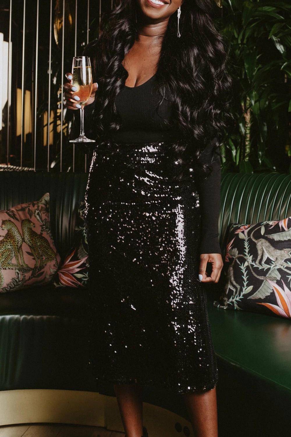 This skirt is as extra as Cardi herself. Cardi is our newest sequin skirt, made with an elastic waist and is midi length. She is so cute with our Patti or Britney bodysuits and a pair of heels, or jazz her up with a graphic tee and sneakers.