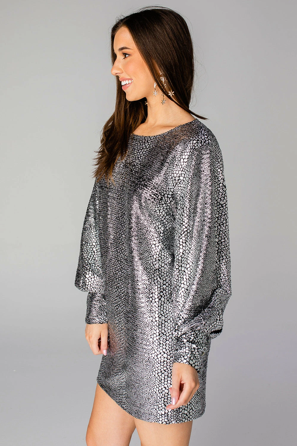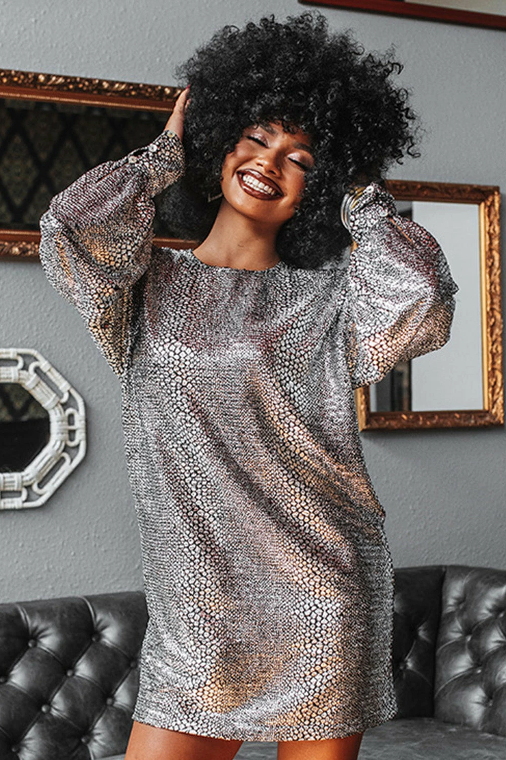Cha-Cha the night away in this show stopper of a dress! This dress features long balloon sleeves, a button closure, silver crocodile pattern and mid-thigh length. Pair with neutral heels for an effortless-glam look!