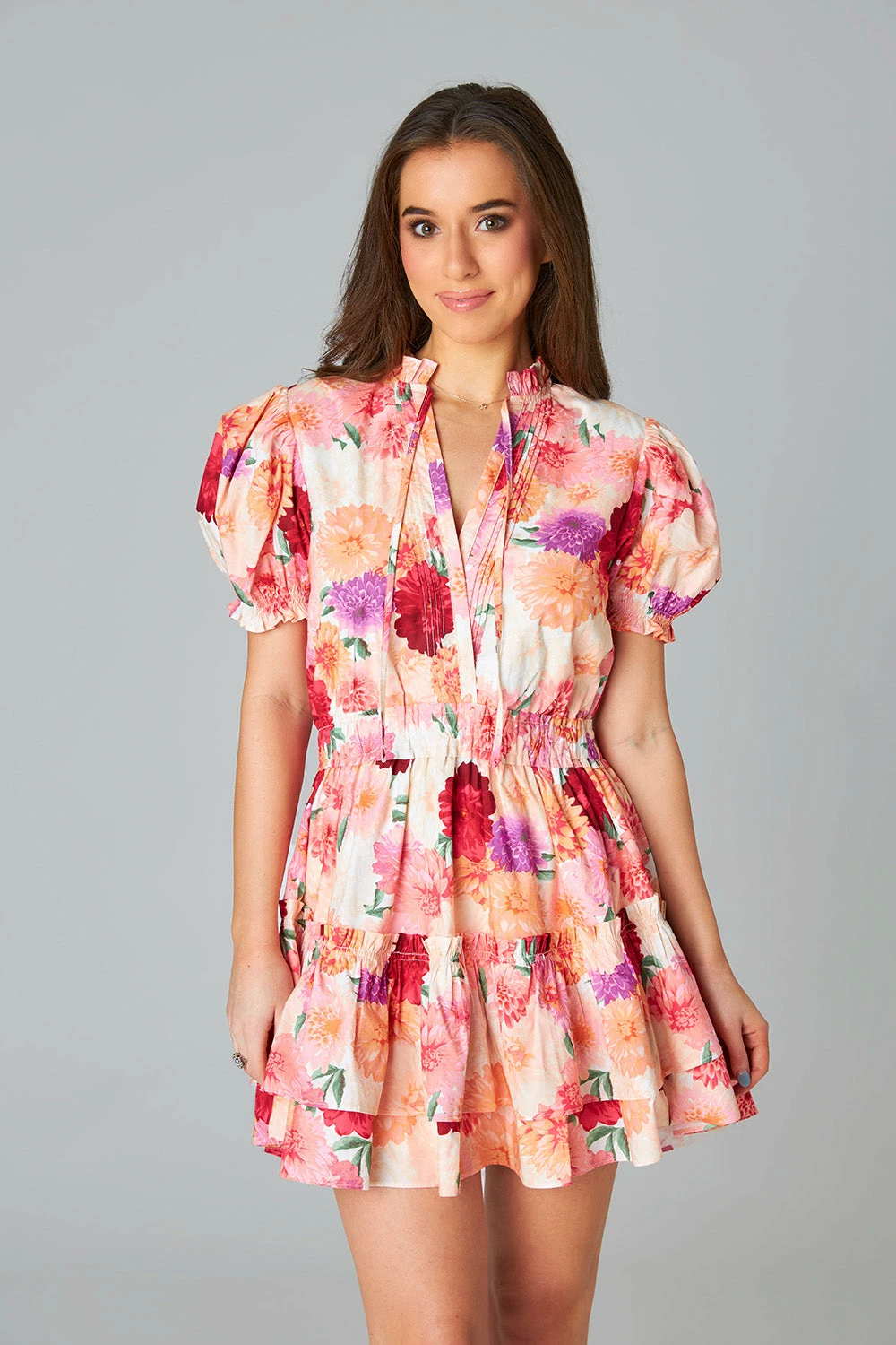 A #babecrew favorite is back in a new pattern! The Clementine Dress features a flattering cinched waist, a slight puff sleeve, and a tiered skirt to add some volume. She looks great paired with a big earring and your favorite heels!