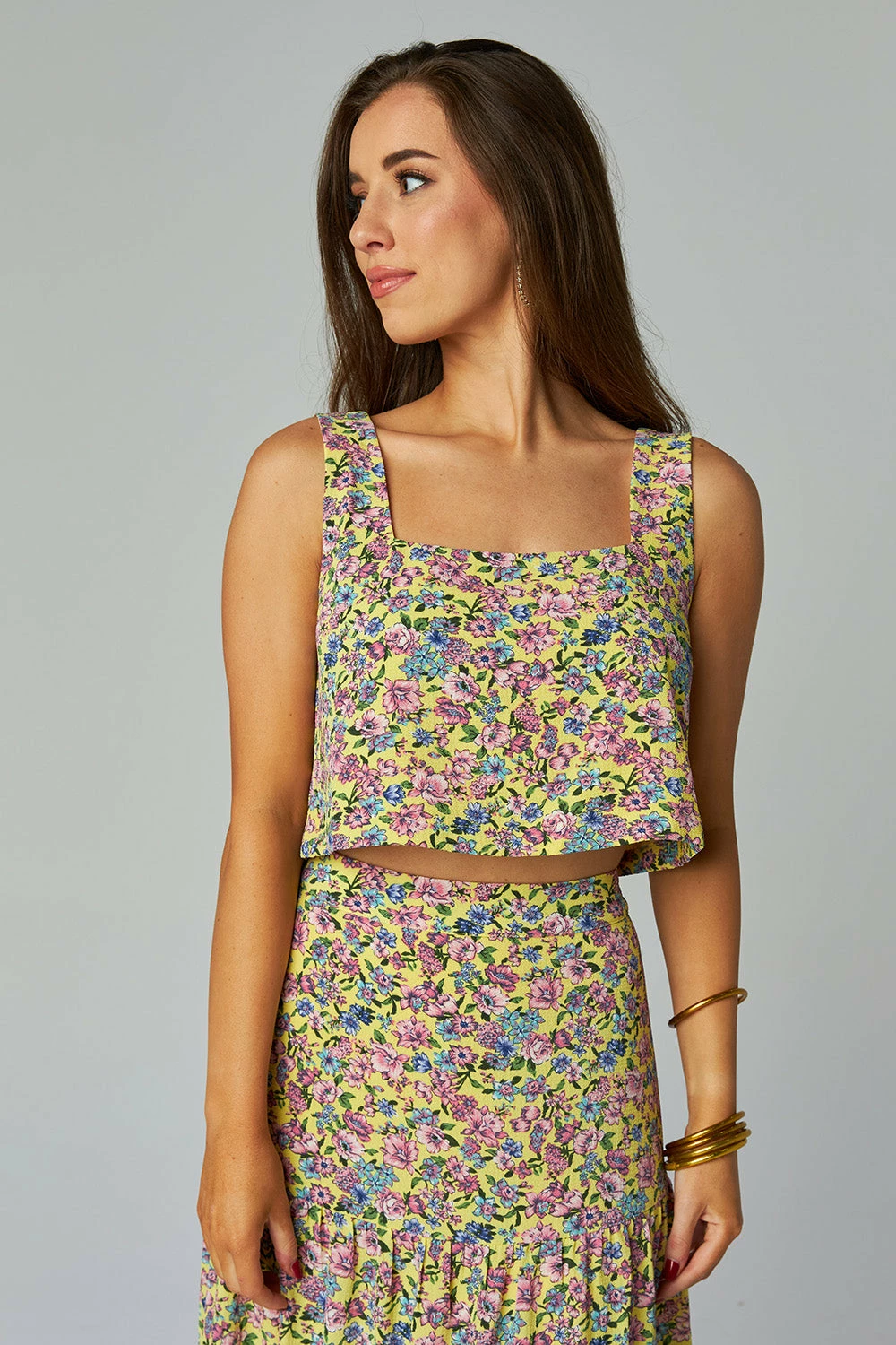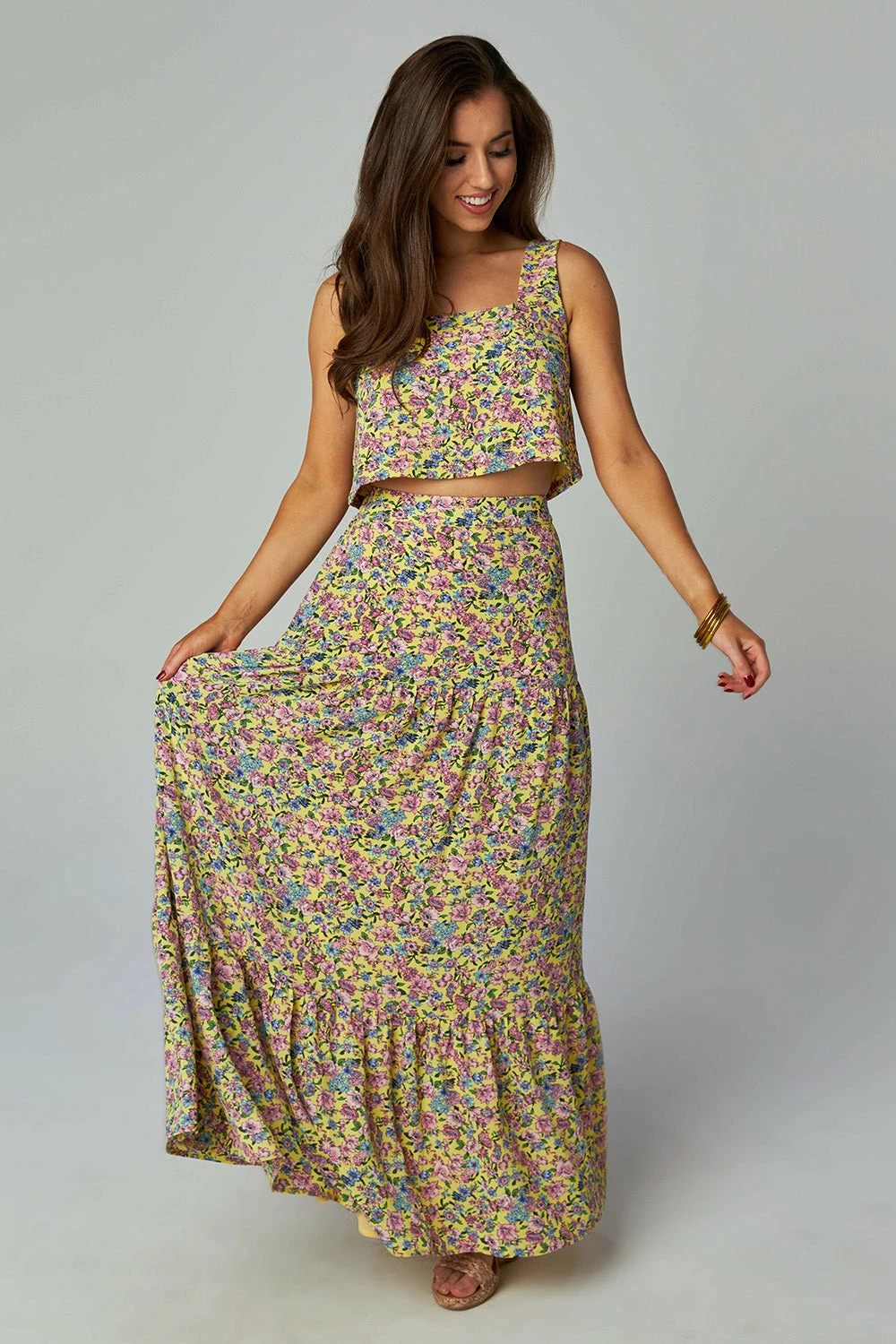 The set is so fun! The Cookie features a cropped tank top with wide shoulder straps, elastic waist maxi skirt, and tiered layers on the skirt. Pair the top and skirt together with some studded sandals and dainty jewelry, wear the top with some high-waisted Moonshine Jeans and wedges, or style the skirt by itself with a white bodysuit and brim hat!