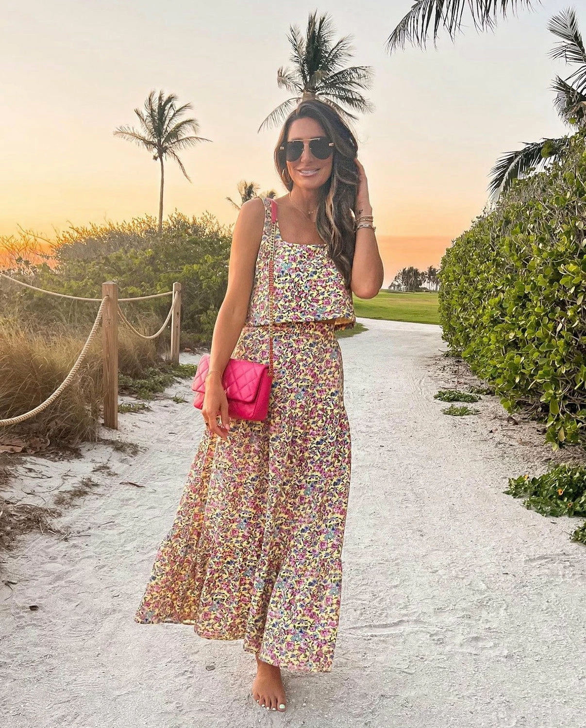 - Length: The top hits just above the belly button and the small measures to be 16.5″ from shoulder to hem. The skirt is maxi length and the small measures to be 38″ from waist to hem.
