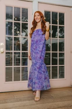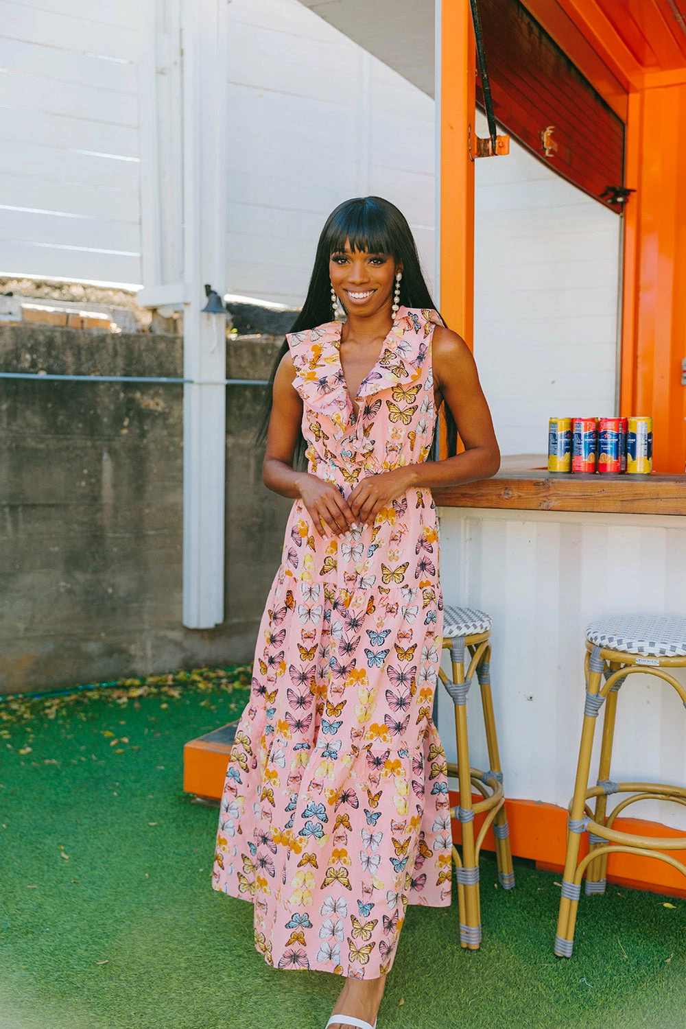 The butterfly trend isn’t going anywhere anytime soon! We’re bringing you our Crawford maxi in our brand new Flutter print. This silhouette features a plunging neckline with ruffle detailing, plunging back with tie closure, and an elastic waist for a flattering fit.