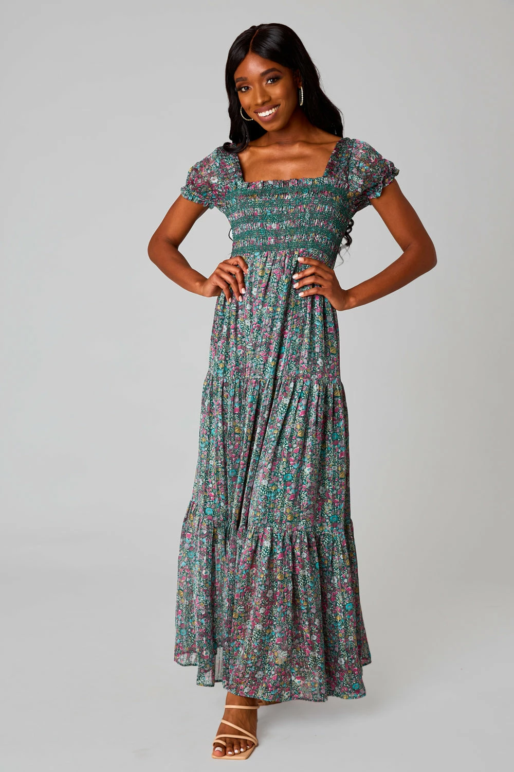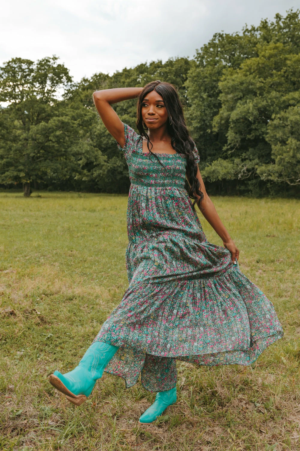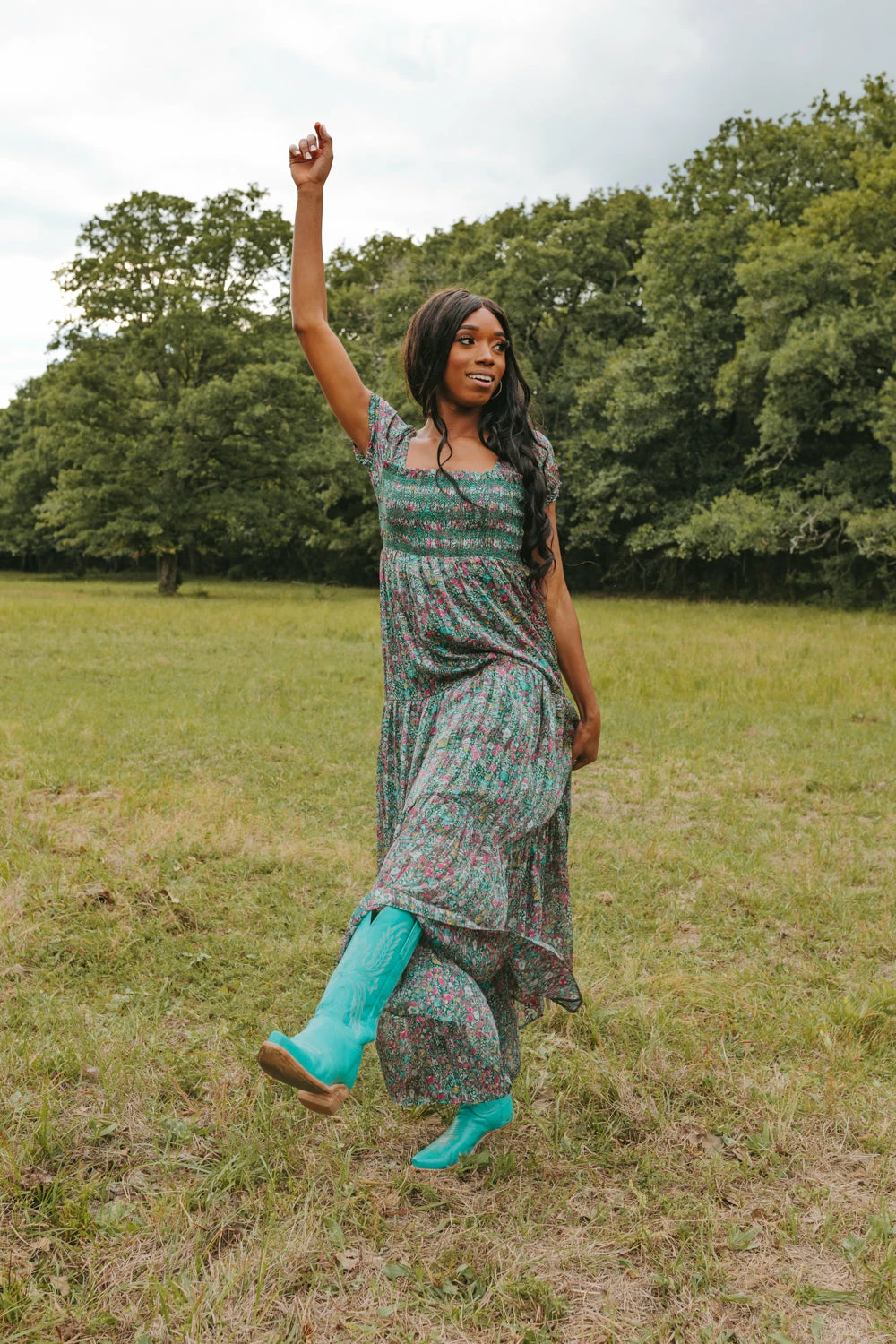 Calling all maxi dress lovers! The Hattie is a LOOK. She features a smocked bodice with a short flattering puffy sleeve, and large tiers down to the ground. Pair her with a big hat and an arm full of bangles for a cute boho look.