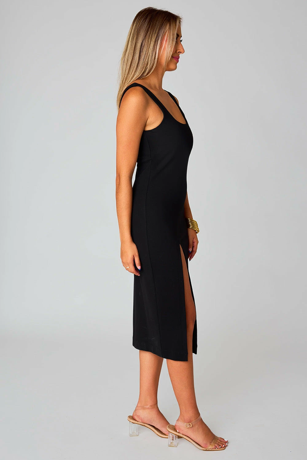 The Hayes bodycon dress is the perfect transition dress! You can wear her with sandals and wide brimmed hat while it’s still warm and transition to wearing her under a leather jacket and with booties for fall. The Hayes dress has a zipper closure in the back and mid-thigh slit on the right side for a flattering fit.