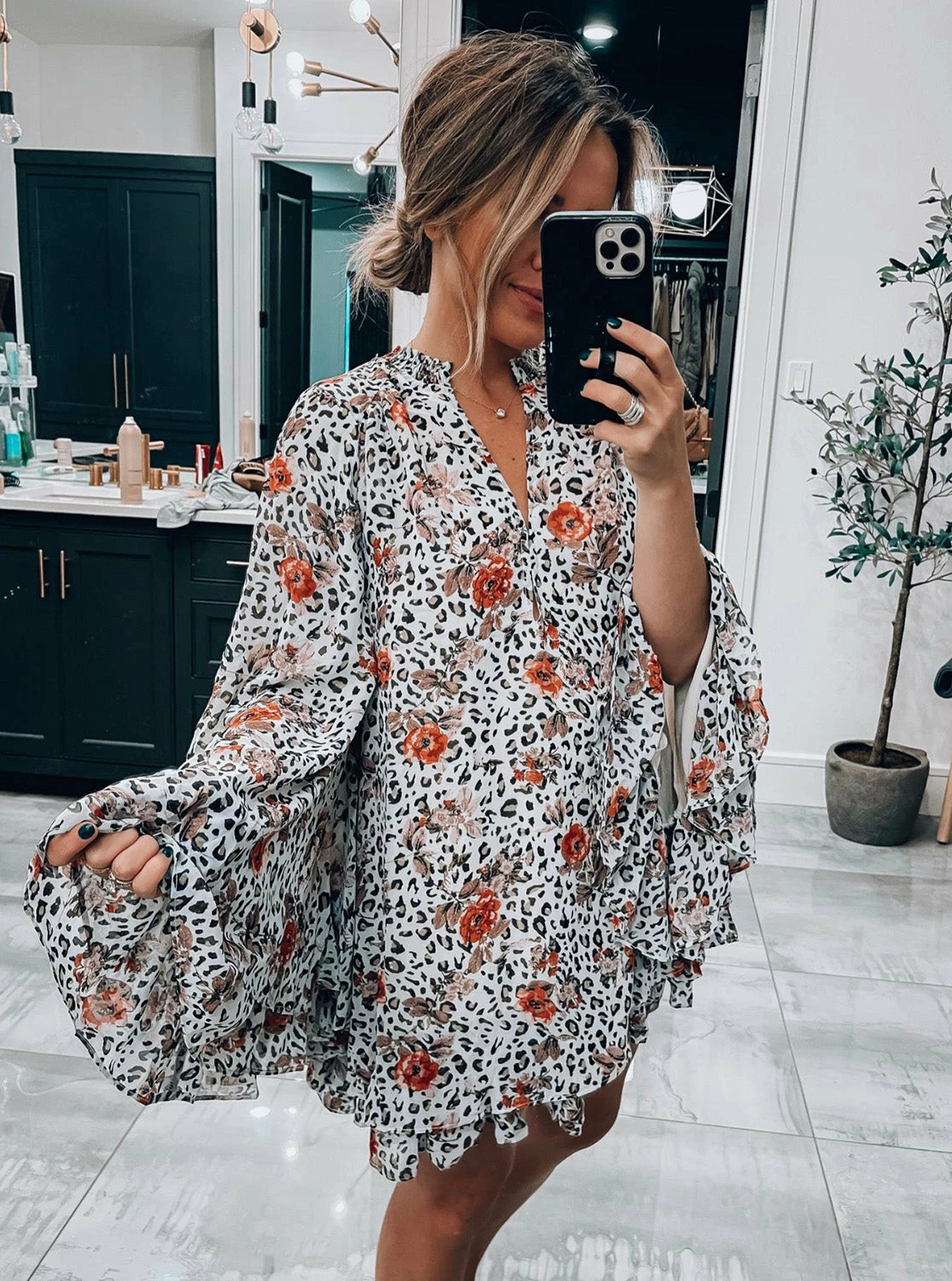 Fun and flirty is the only way to go this fall! Our Jasmine Dress is perfect for your next occasion! She features an extreme bell sleeve, v-neckline with hook and eye closure, double layered, and smocked detailing on the shoulder.