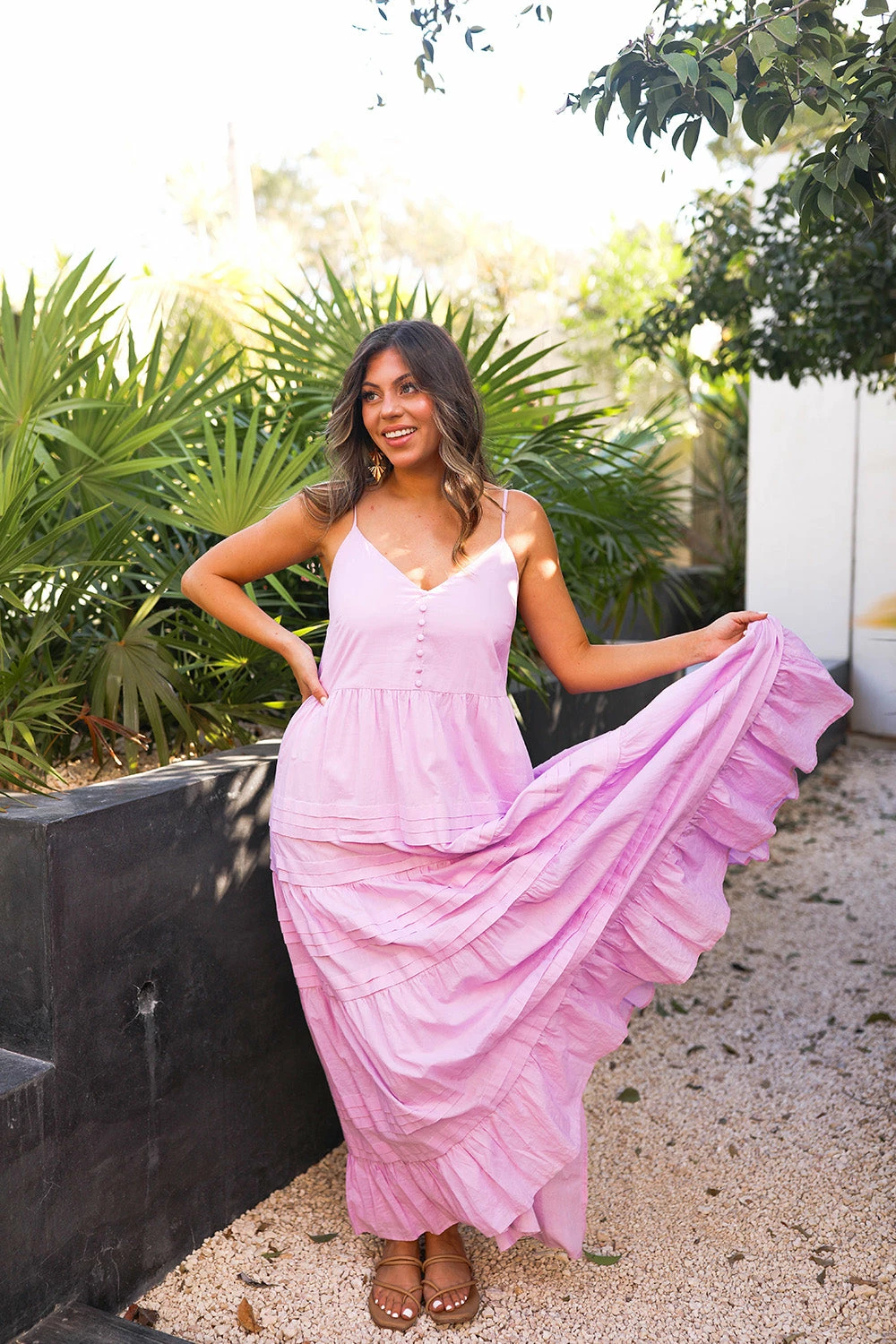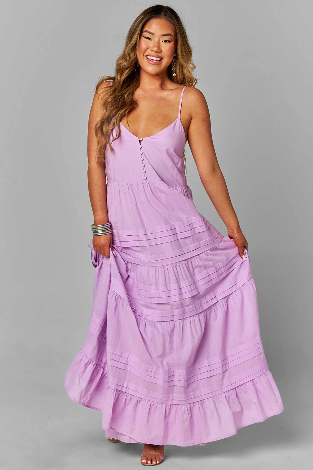 Make a statement in the Jaxon Tiered Maxi Dress! In a soft lavender, it features adjustable tie straps in the back, front buttons, and lush tiers of fabric. Pair with dainty jewelry for your next date night!