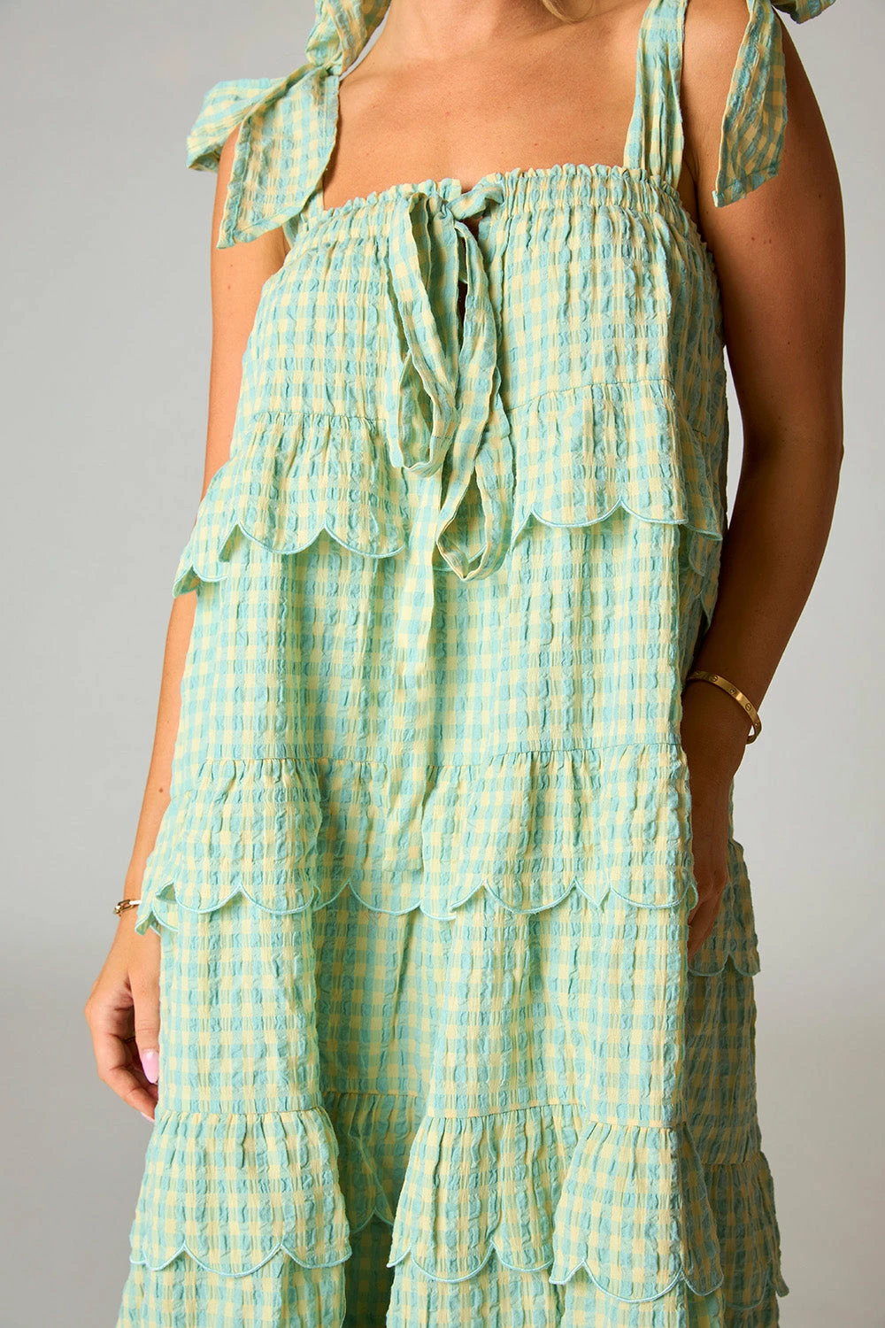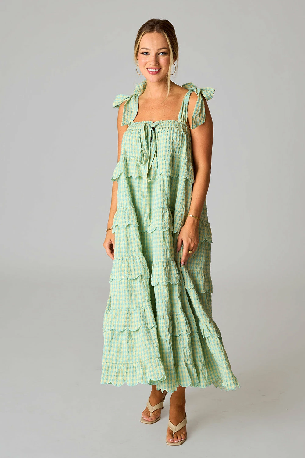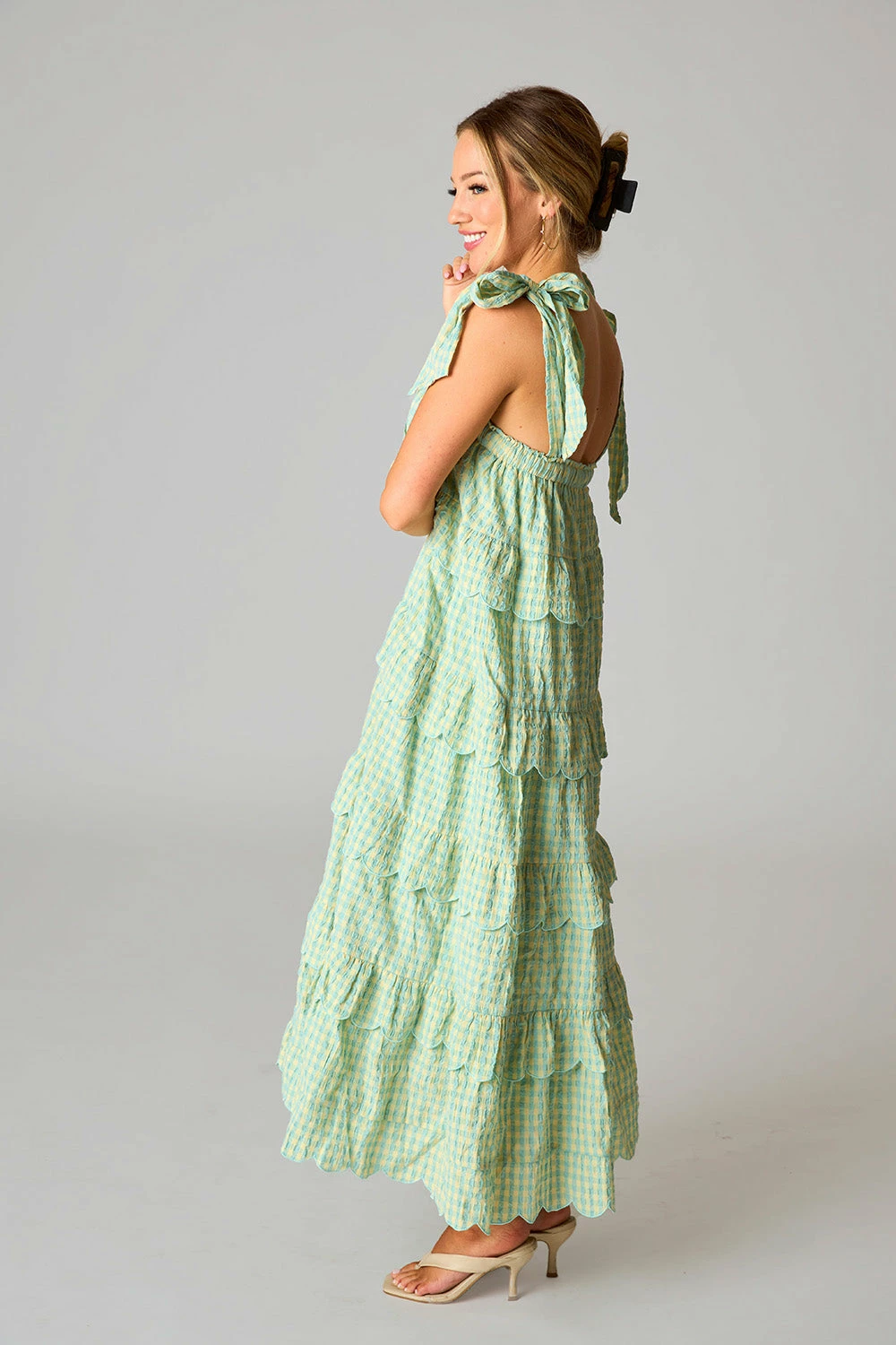 A maxi dress with a flattering silhouette and details that bring it to life! Featuring a square neckline, elastic band around the top, adjustable tie straps, and ruffle tiers. Her yellow and blue checkered pattern make the prettiest pastel color. This dress is comfortable enough to wear all day running errands with sneakers and cute enough to pair with a wedge for date night! The Landon can do it all!