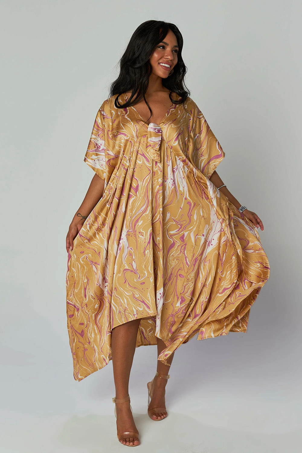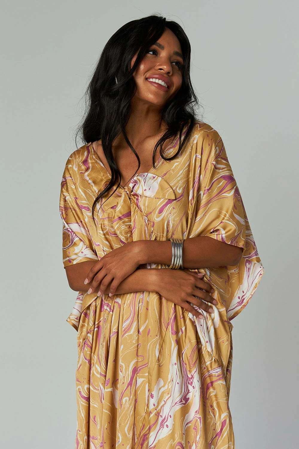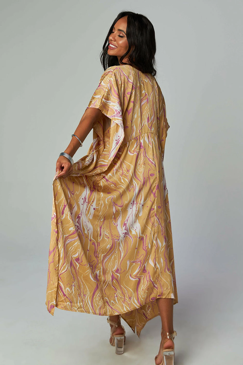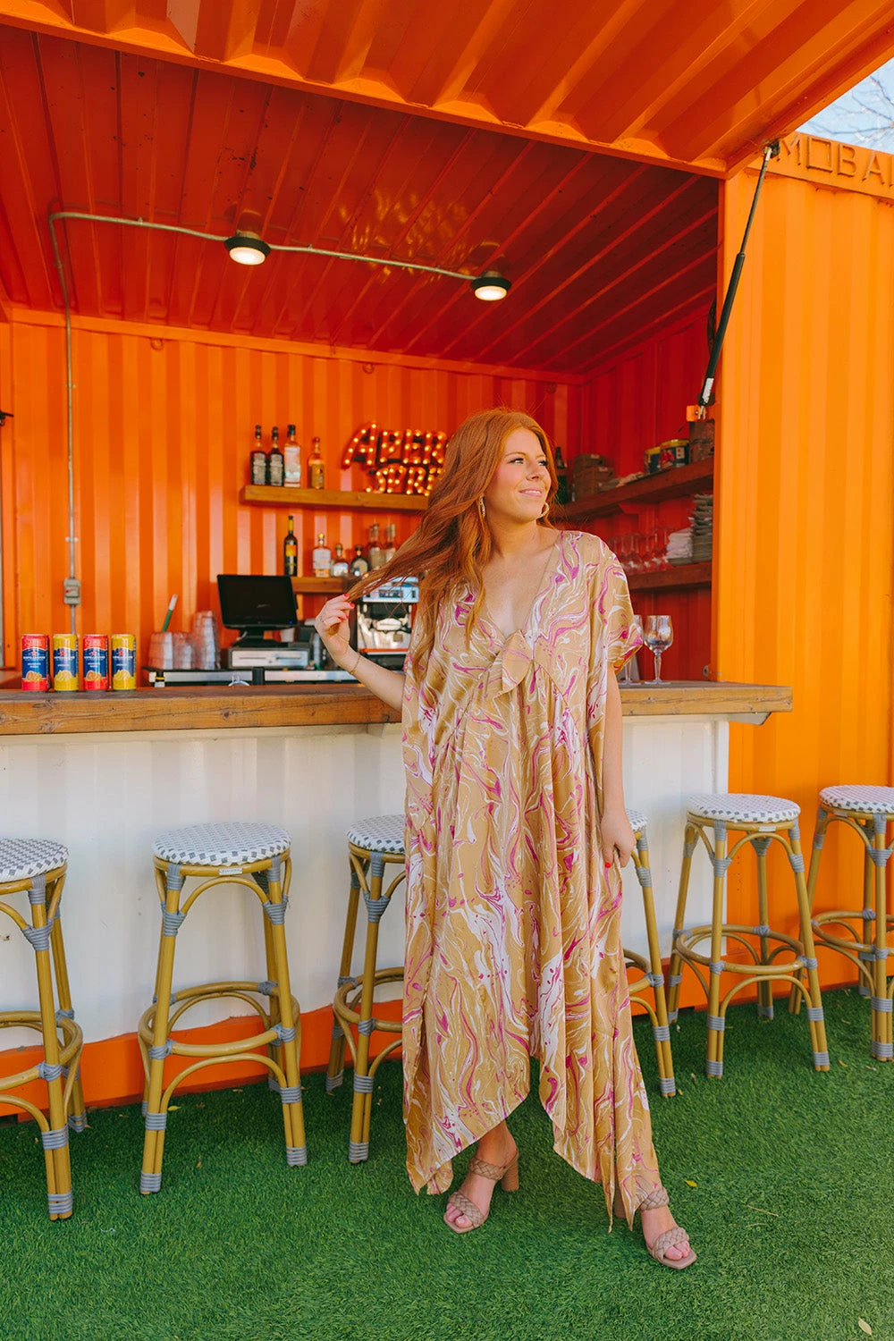 Spend your day at the beach in style with the Mamie in Venus! She features a loose body silhouette, maxi length, tie at the bust, and short sleeves. If this dress doesn’t scream beach vacation, I don’t know what does!