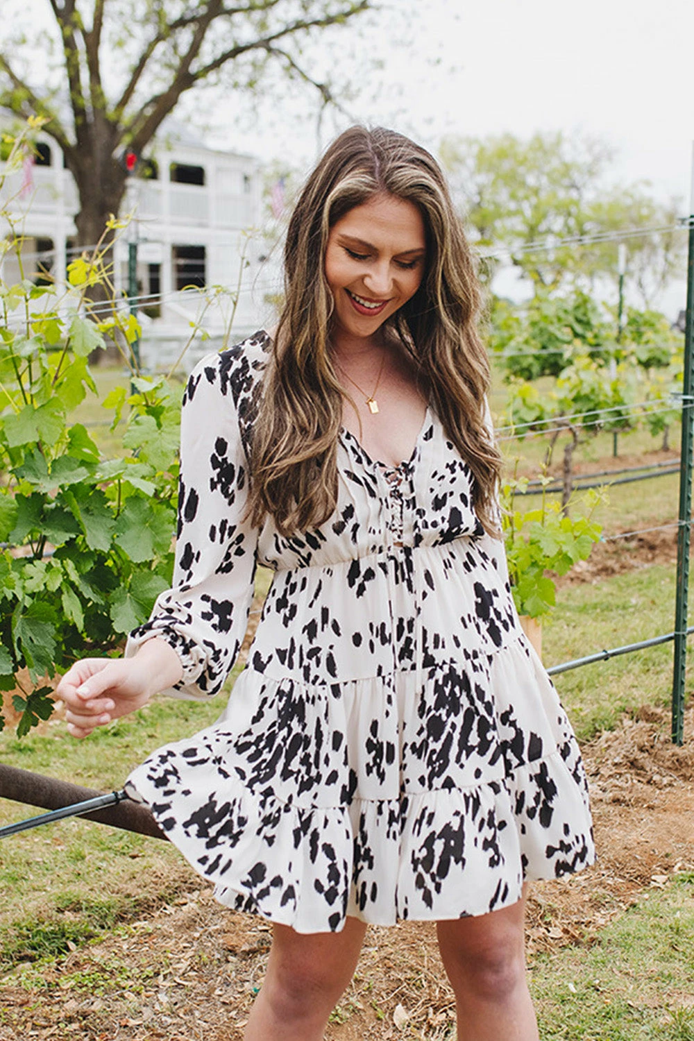 Our Melody Dress features a laced up front to adjust to your liking, an elastic waist, long sleeves with elastic wrist, and fully lined! Pair her with booties and layered necklaces to complete your next concert outfit!