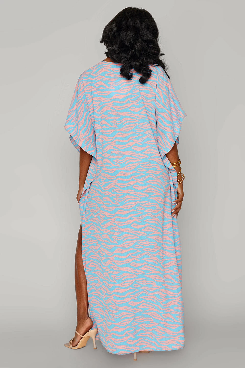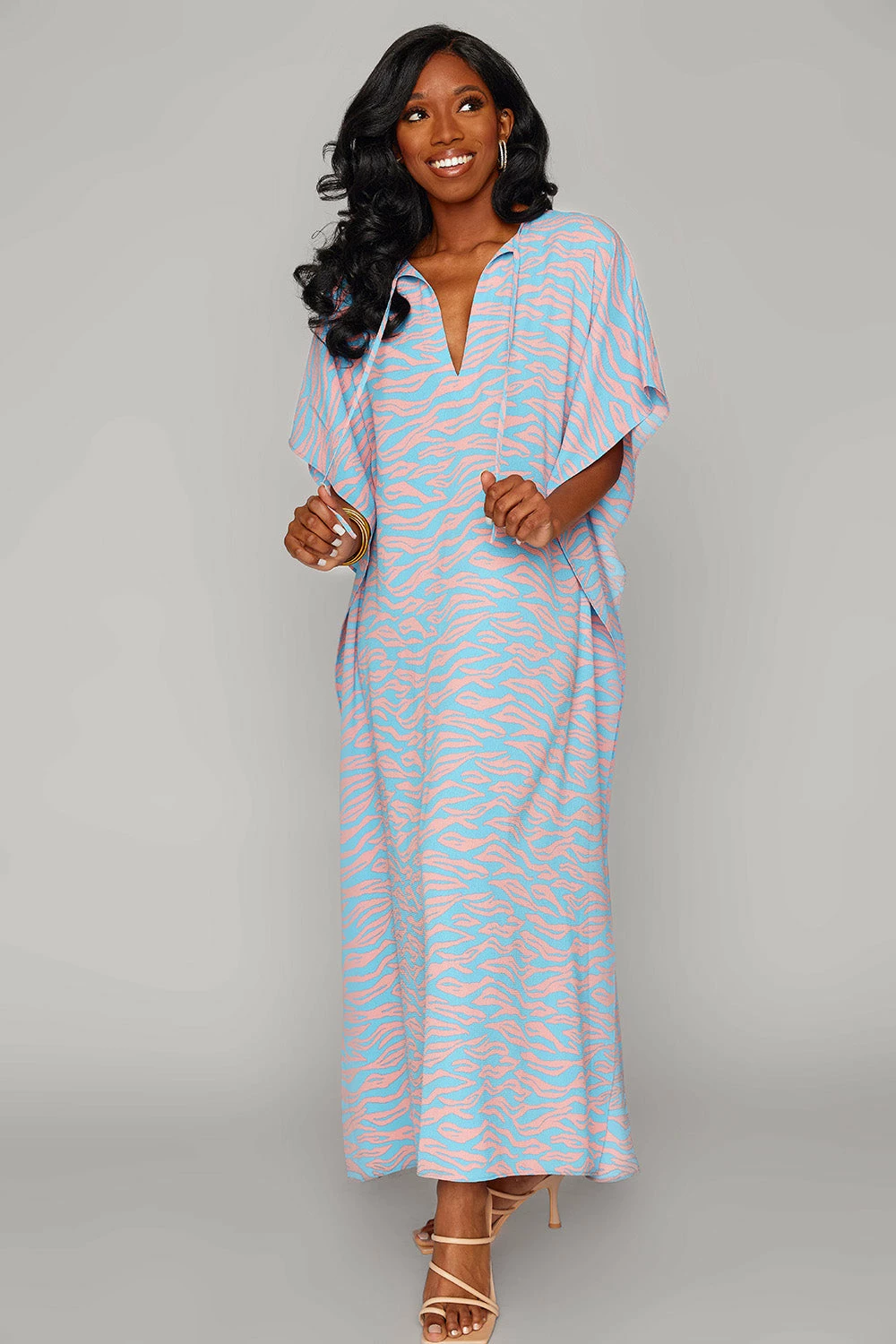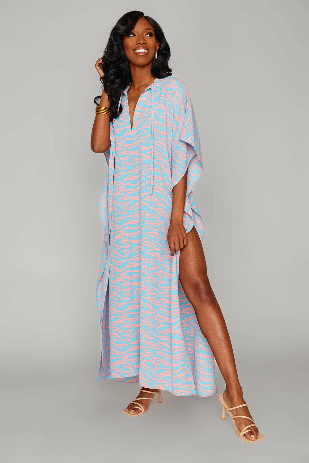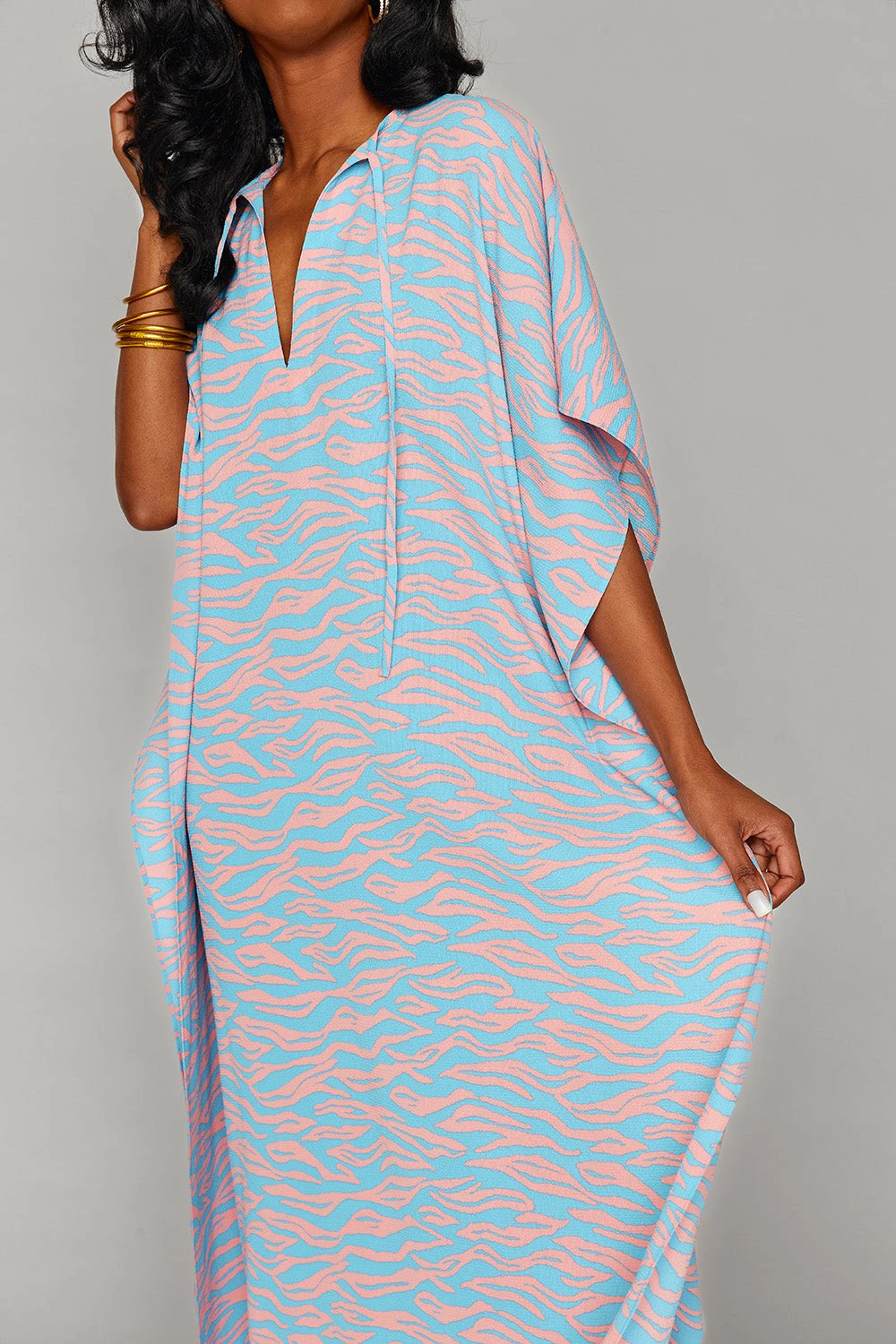 The Miller pairs well with boats and bubbles! She is so versatile and features a v neck with ties at the collarbone, slits on both side and flowy sleeves with a matching flowy silhouette! Take her out on the yacht with some champagne for good times and good vibes!