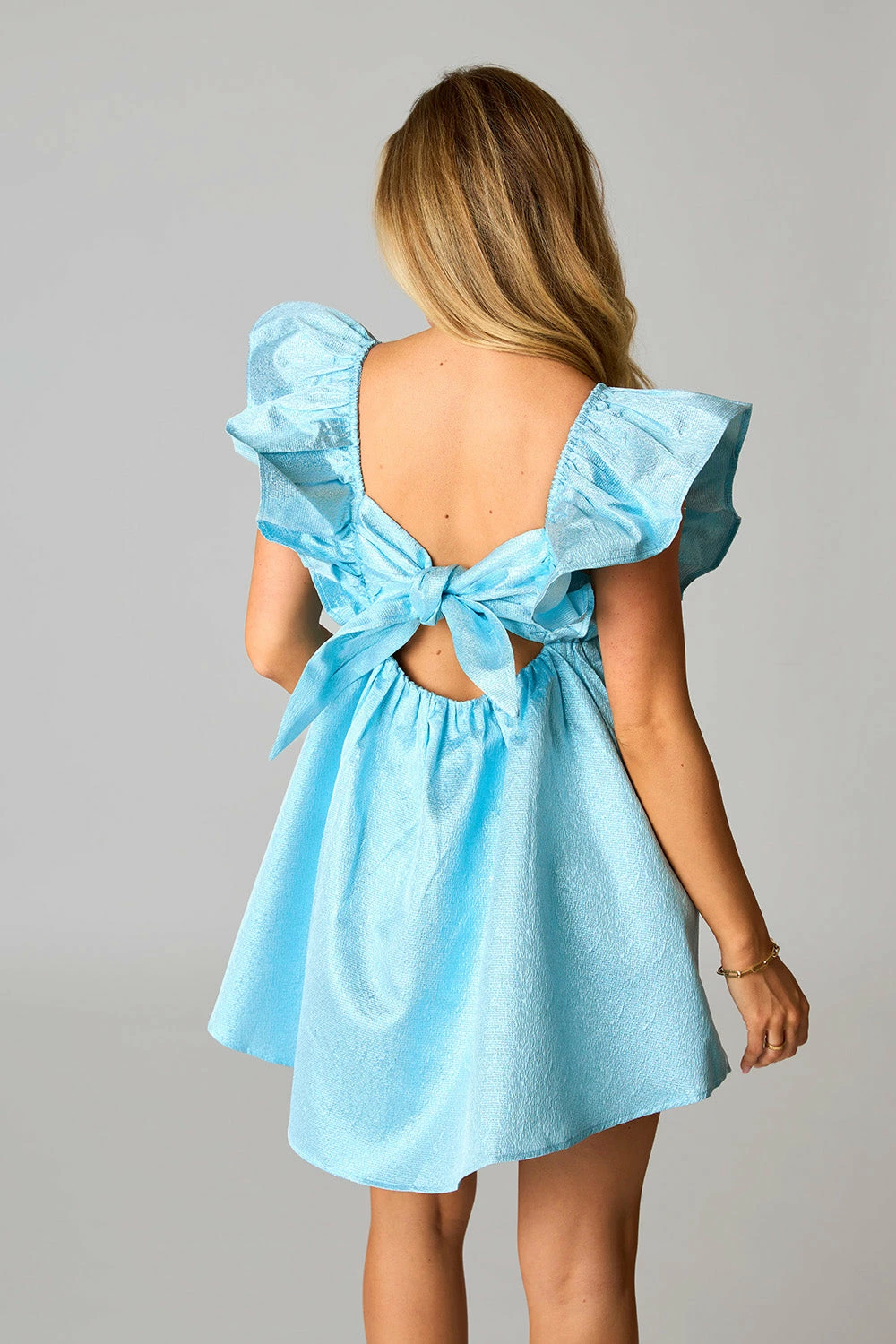 Feel fabulous in an instant with the Penny Dress! This shiny mini dress features elastic ruffle sleeves, a plunging v neck, pockets, and an open back with a tie! Wear her to any party, wedding, or bridal shower!