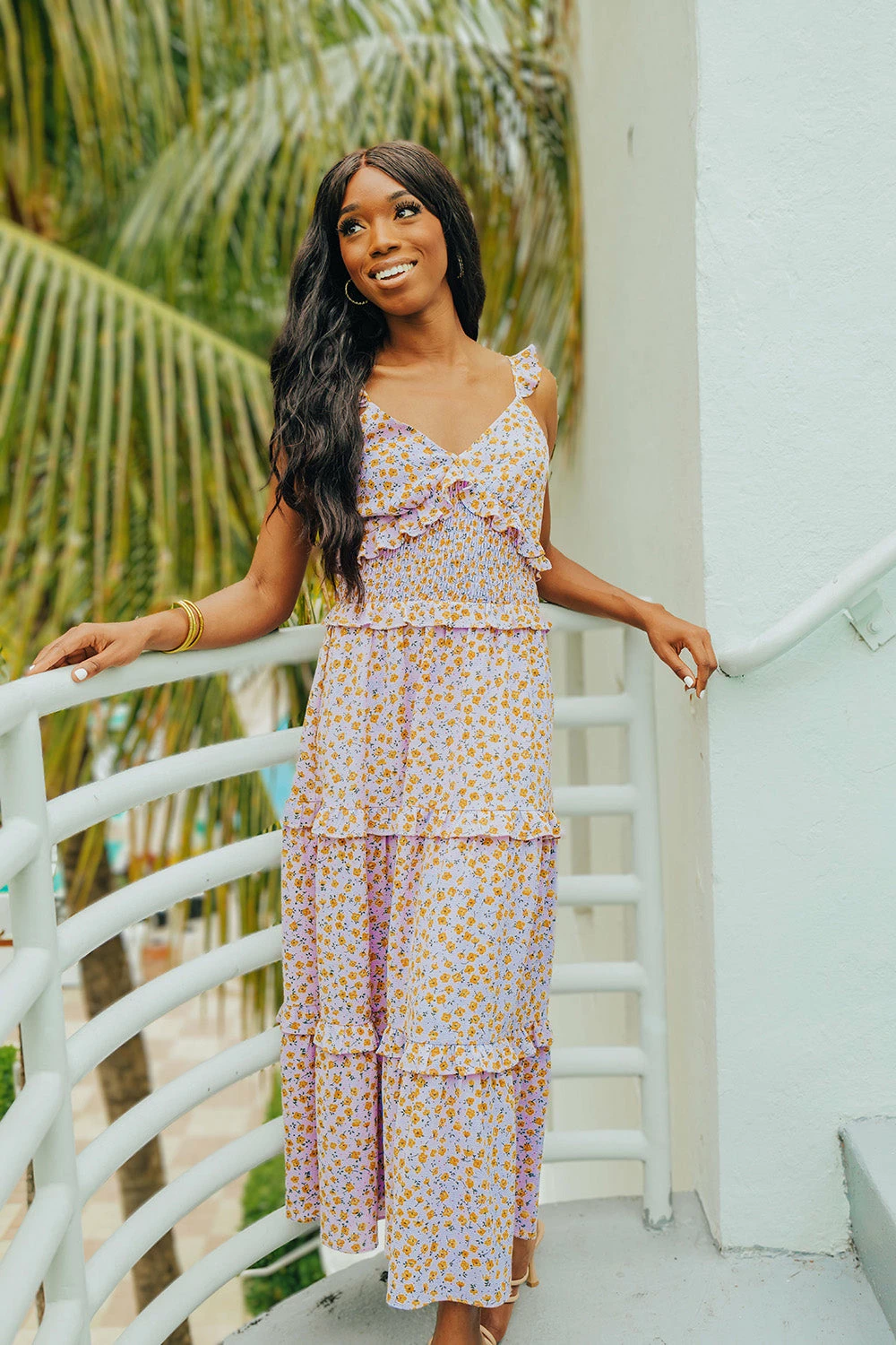 Be the sunflower in a field of posies in this dreamy Buttercup print maxi dress. Adjustable straps and a tiered skirt have us falling head over heels for this flirty piece! It’s made for summer adventures and date night alike!