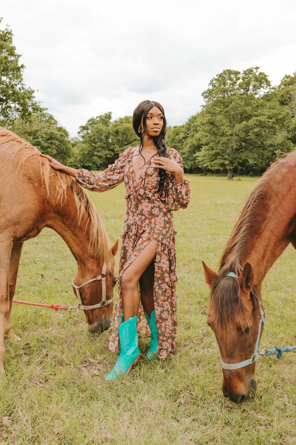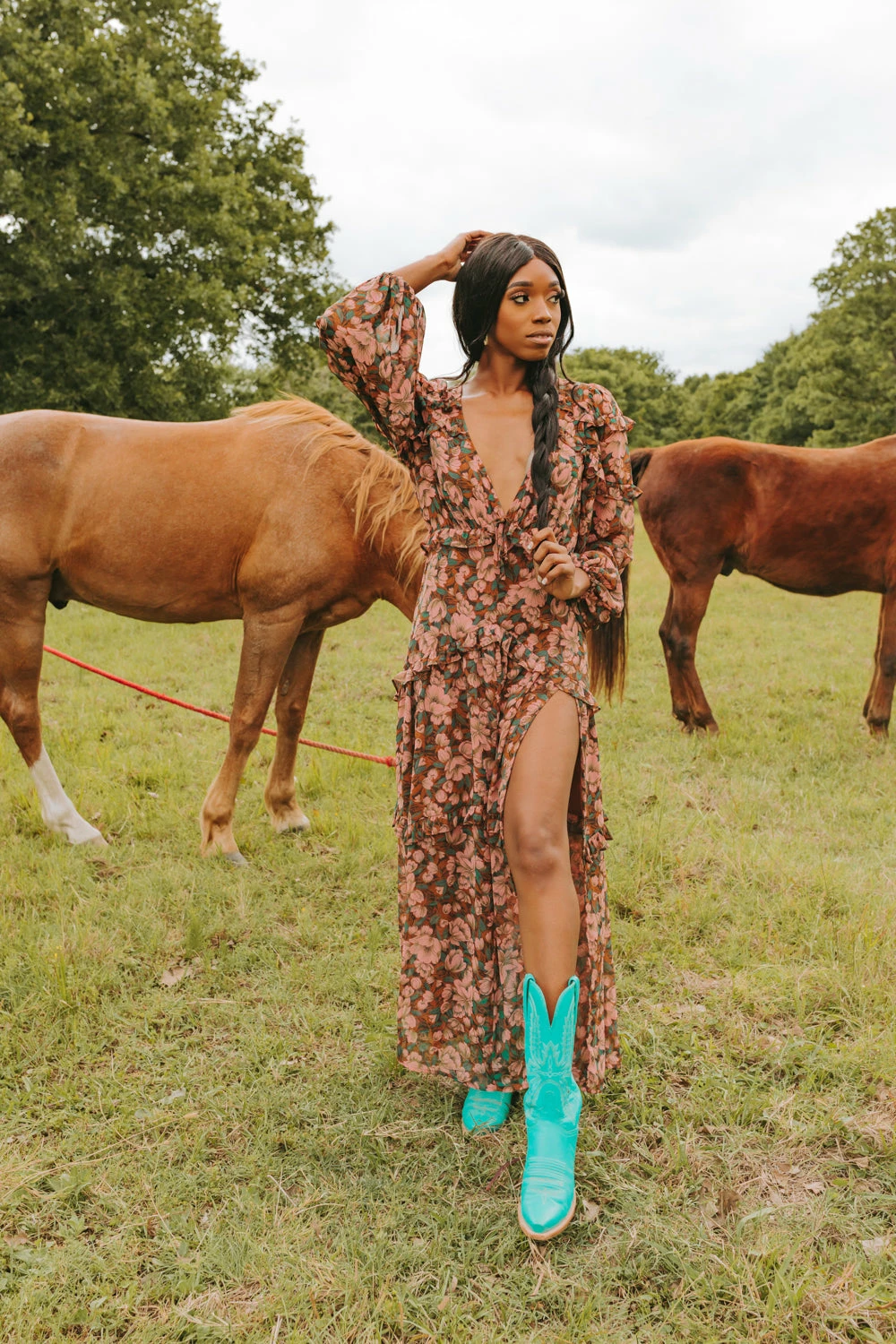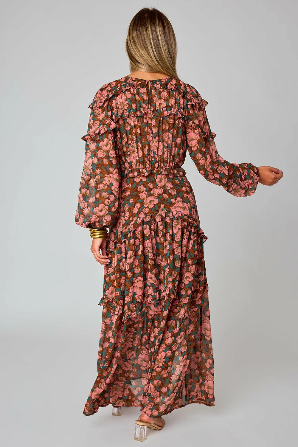 An easy maxi in our NEW Lost Lovers print. This silhouette features a deep v neck, a mid-thigh slit, and ruffled detailing for a flattering fit. The Pia Maxi Dress can easily transition from brunch to date night!