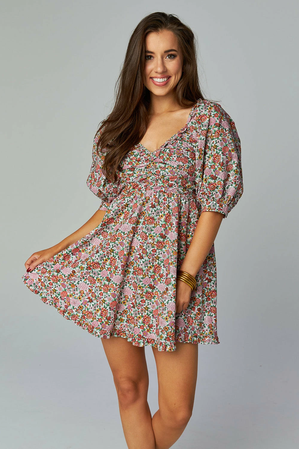 There’s no better spring piece than our beautiful Poppy Mini Dress featuring puff sleeves with ruffle hem, v cut neckline with ruching throughout the bodice, and a-line skirt with adorable ruffle hem. Style with your favorite nude heels and statement jewelry!