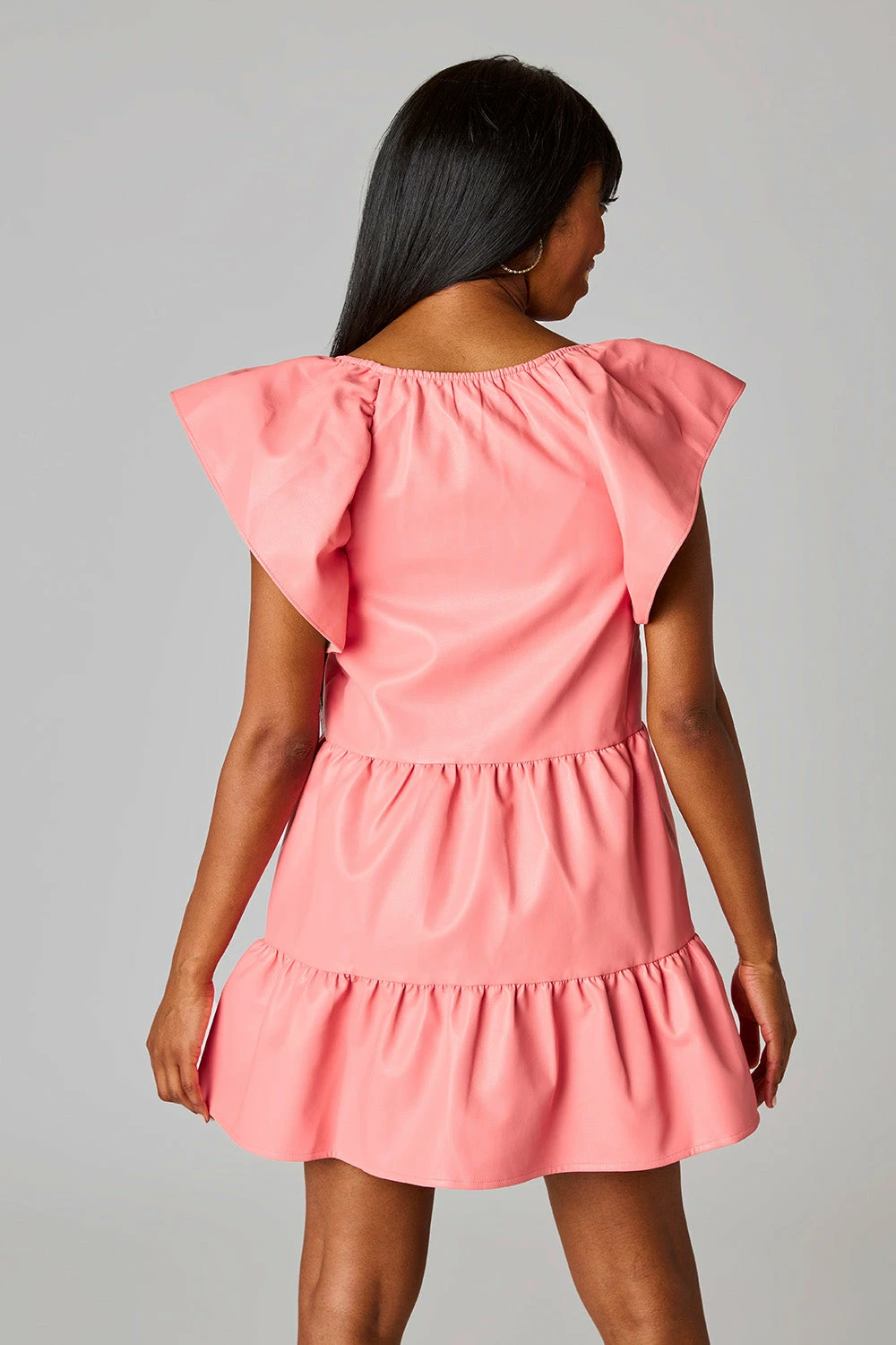 This dress has us feeling flirty and flawless! Made with faux vegan leather, The Ronnie Dress features a v neckline, a flowy silhouette and mini length. Pair with flat sandals for an effortless look!