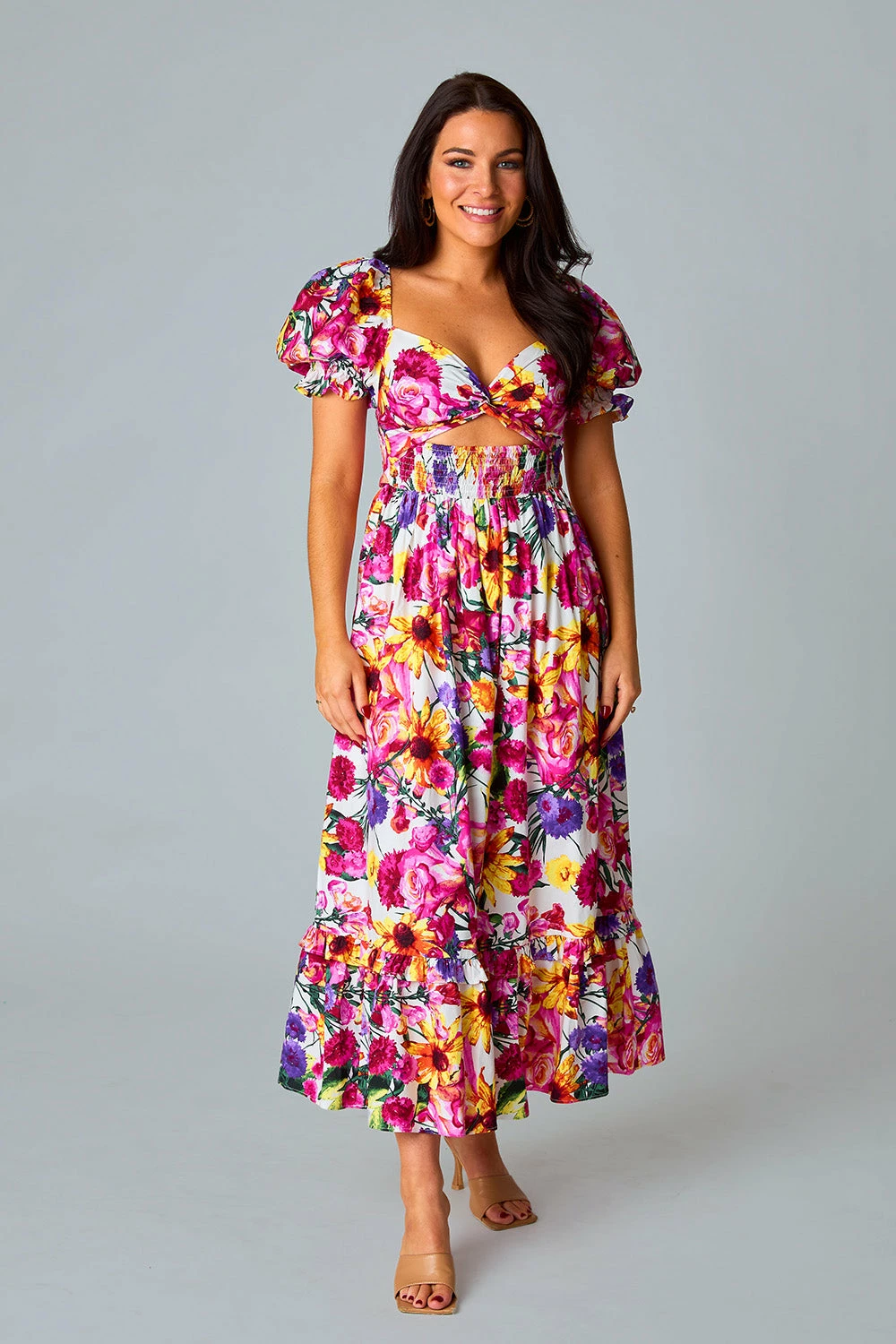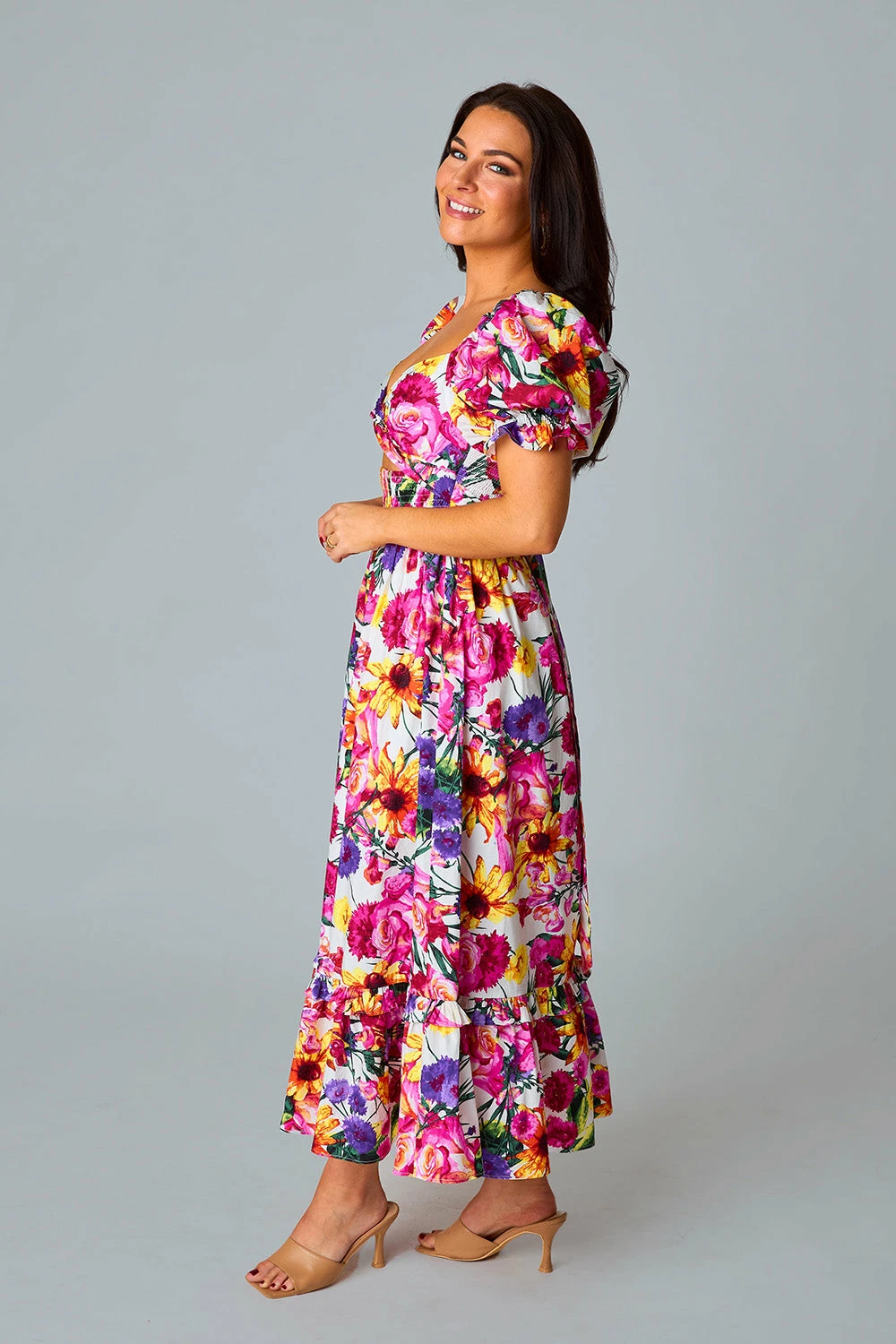 - Bust: Smocked back allows for stretch, accommodates most bust sizes. Not bra friendly.