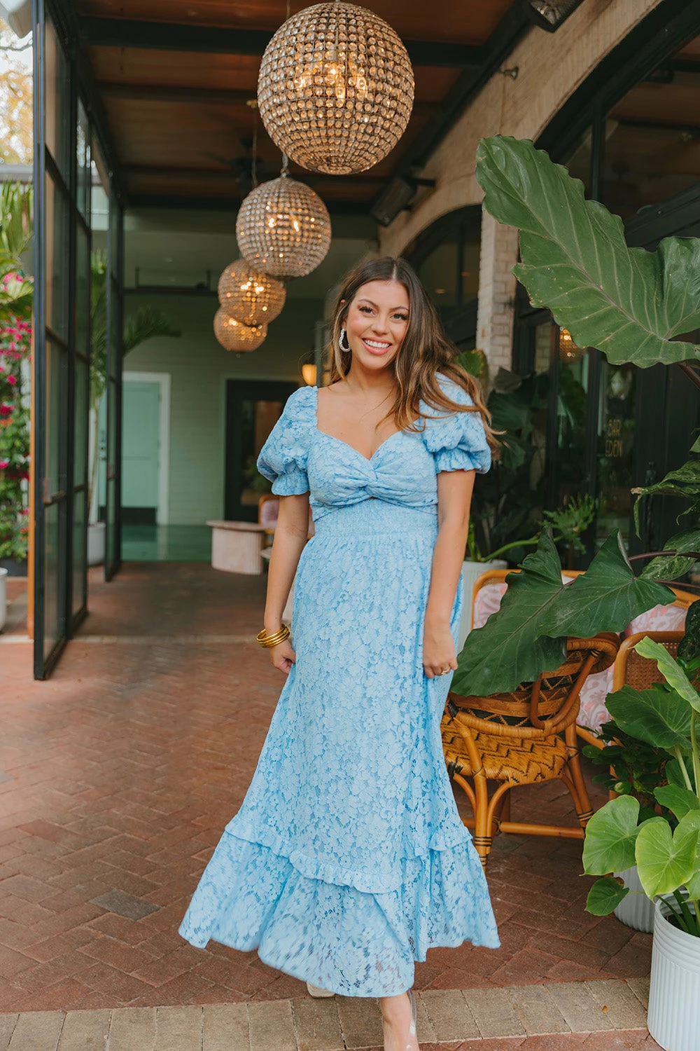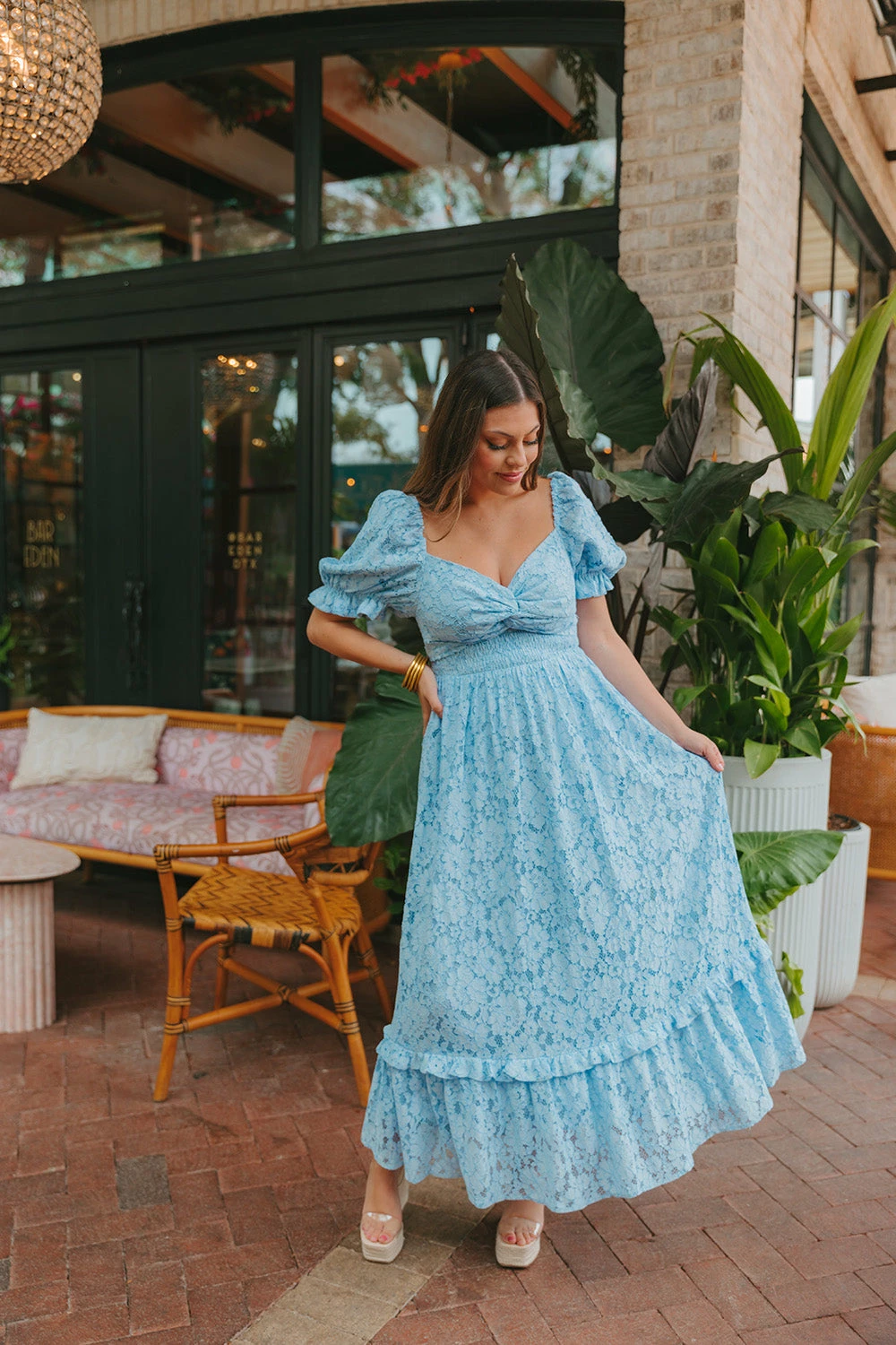 Perfect for any occasion, the Ross Dress features a twist front sweetheart neckline with a cutout underneath. The smocking beneath the cutout and in the back allow for a comfortable wear. The lace fabric, elastic puff sleeves, and belt in the back add the finishing details to make this dress an absolute beauty!