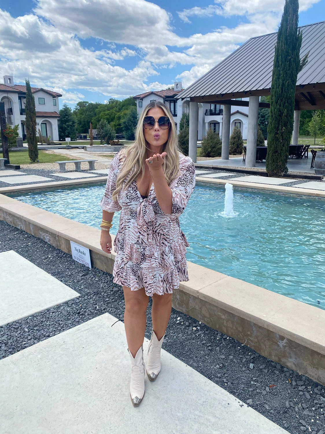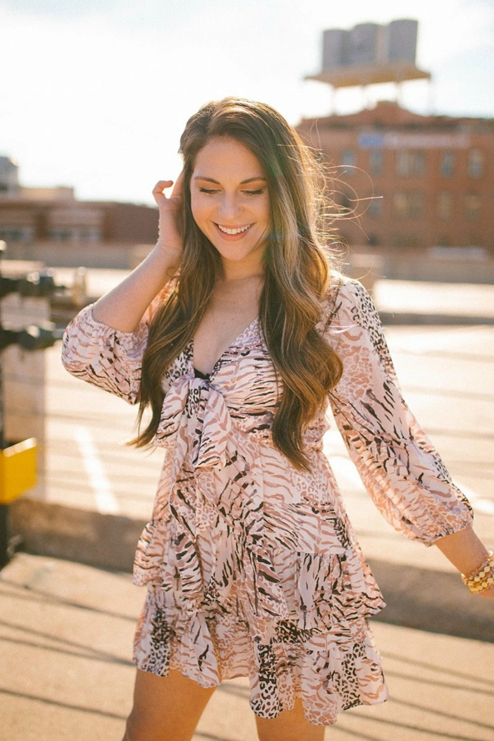 The Sadie dress is a classic that you will never get tired of wearing! The ruffed edges are flattering for any body type and the bow front detail is super fun. Add some flatform shoes or booties and a leather jacket when it cools down at night!
