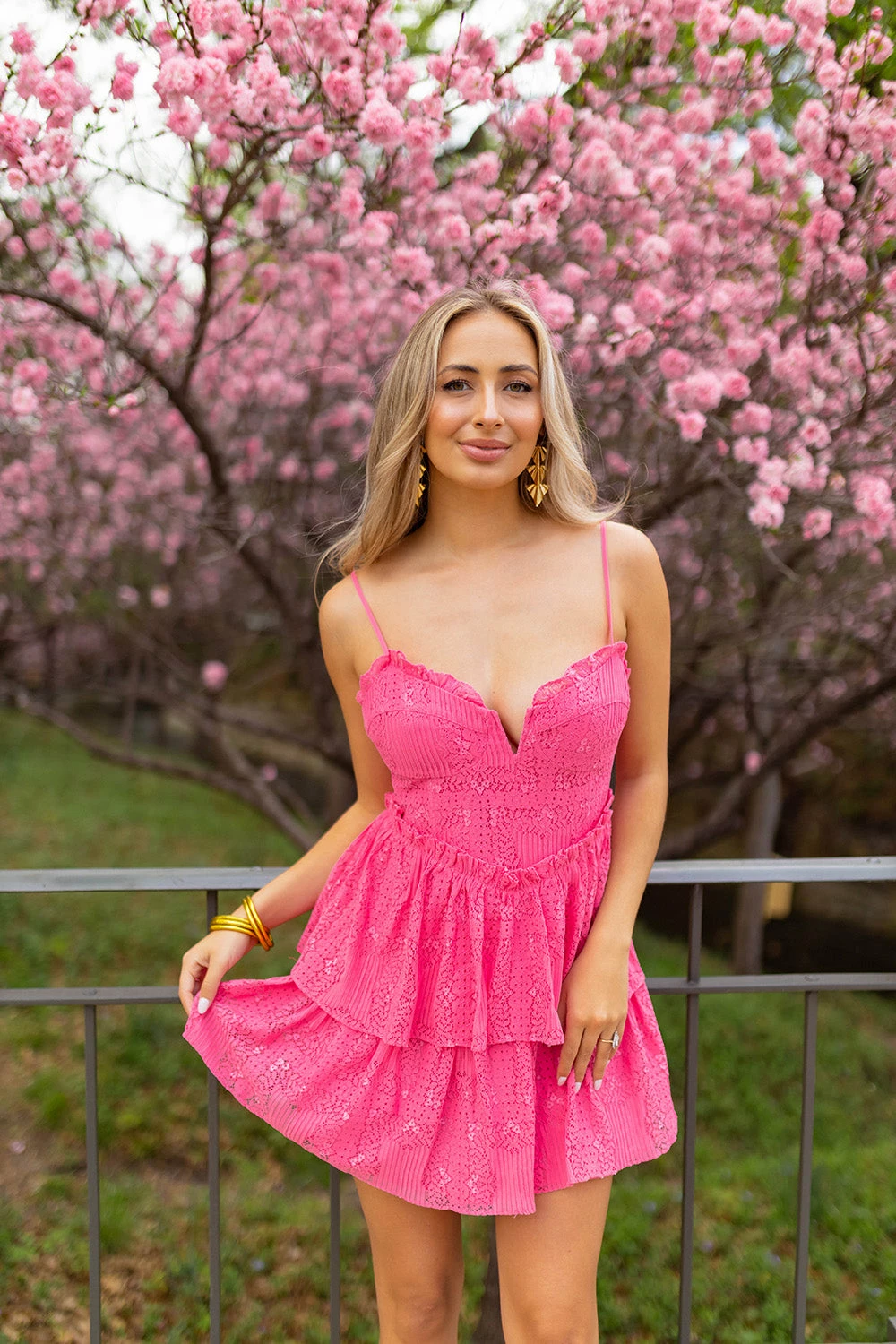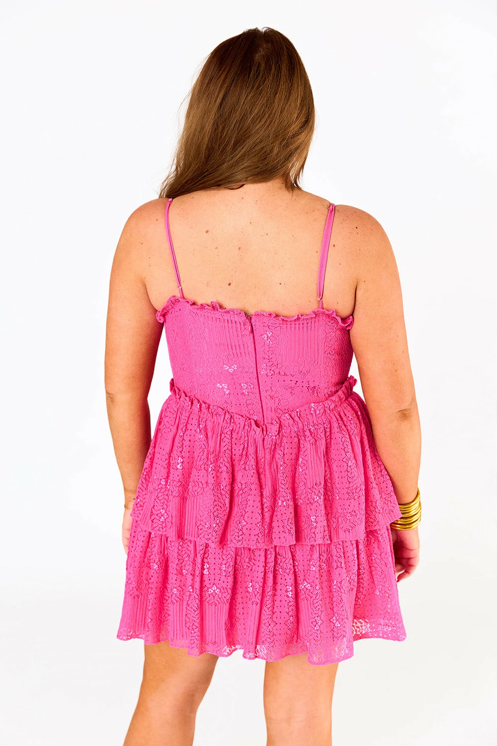 Here she is- the mini dress of the season! The all new Sissy Dress features beautiful pink lace fabric, a sweetheart neckline with a boned v on the bust, and a tiered ruffle skirt. She has adjustable straps and a zipper back for a comfortable fit.