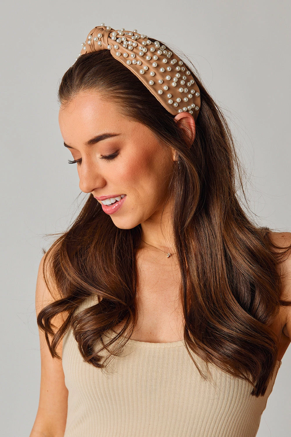 This Charlotte is an elegant, neutral tan headband studded with pearls. This feminine piece will look good with any outfit this season!