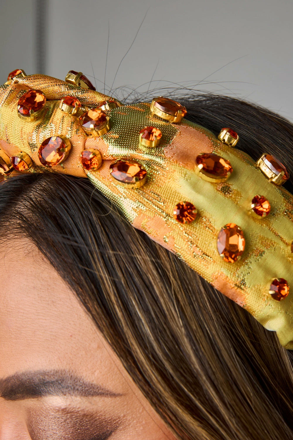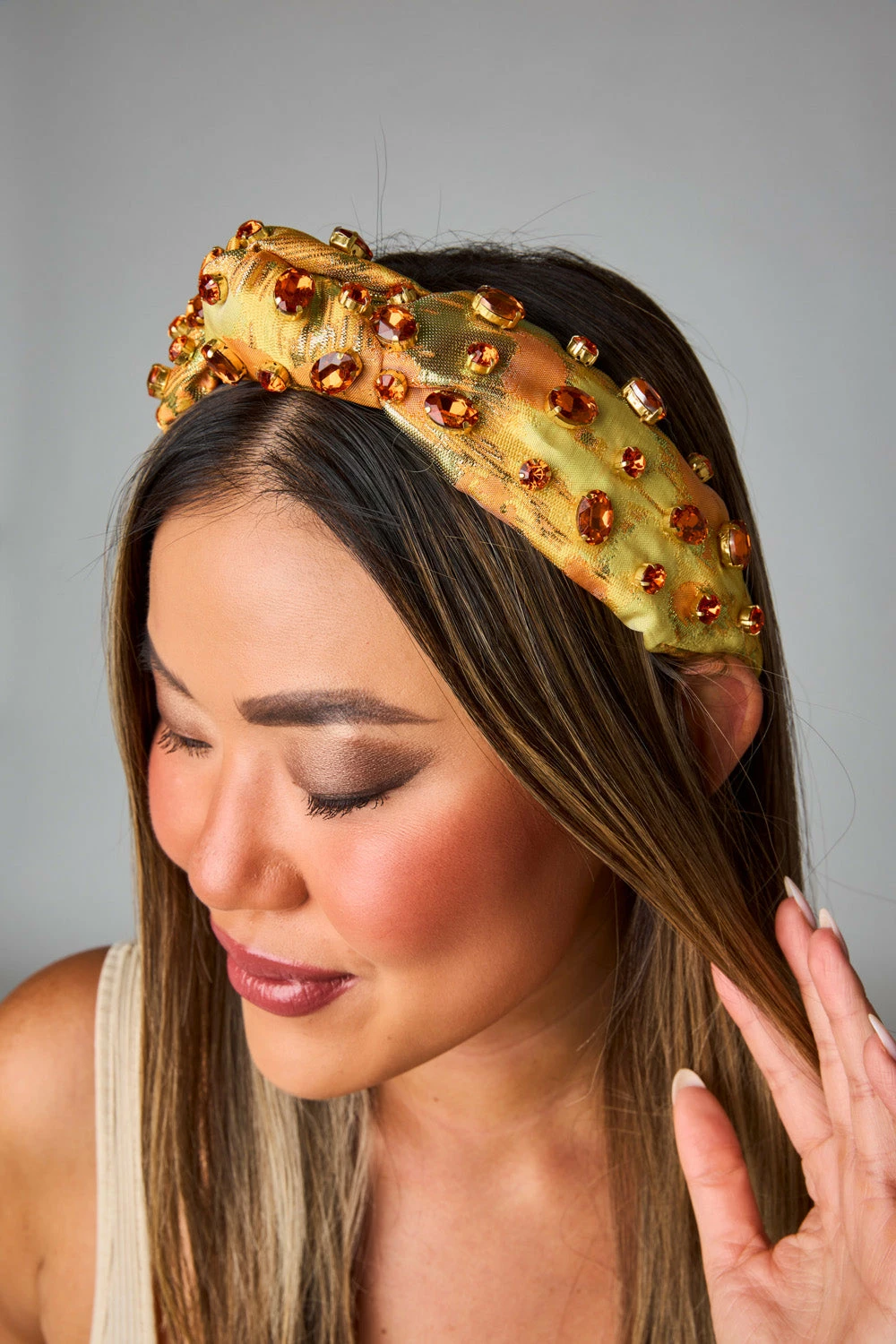 The Eleanor is an elegant headband with studded crystals on a beautiful yellow patterned fabric. This feminine piece is sure to compliment any outfit this season!