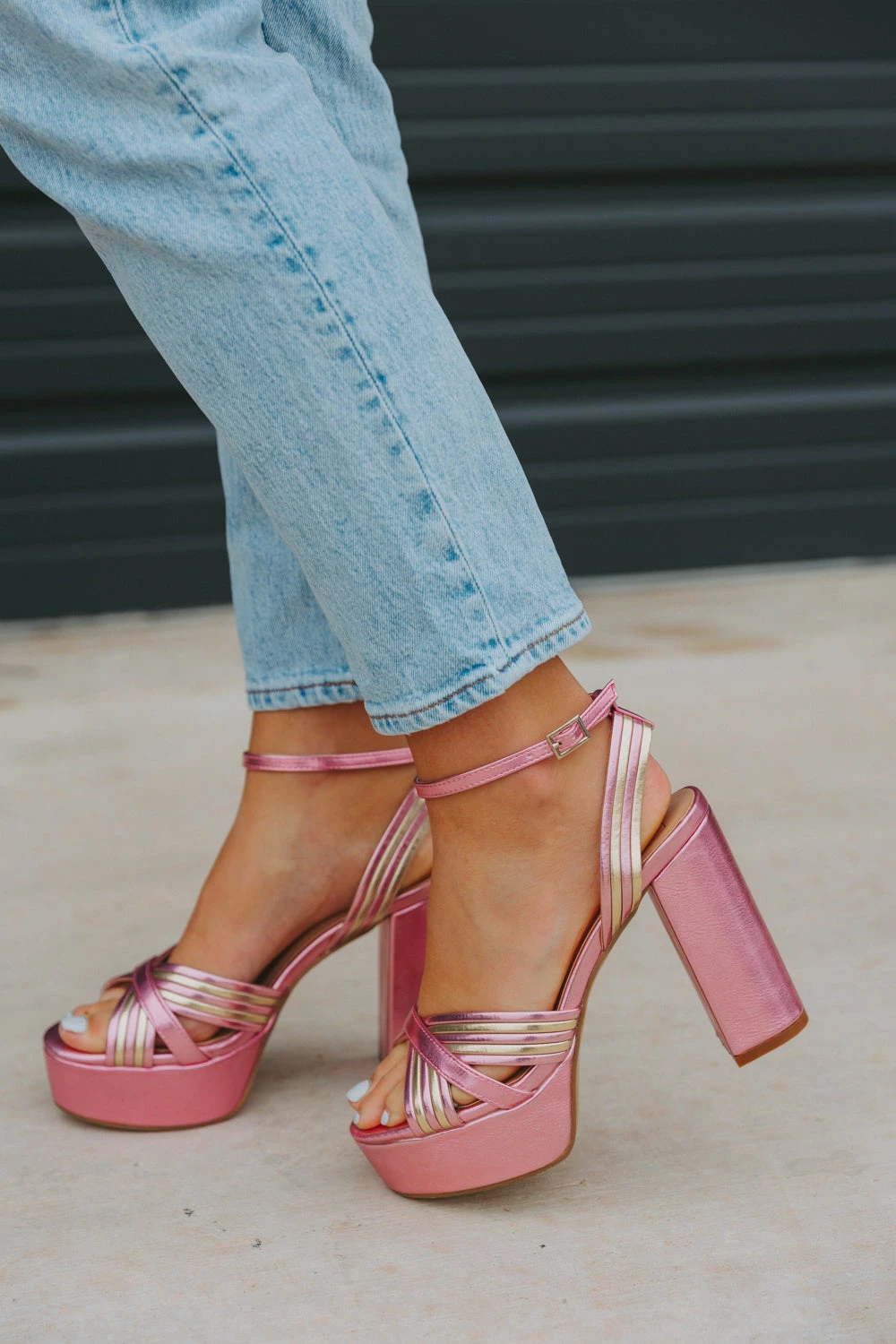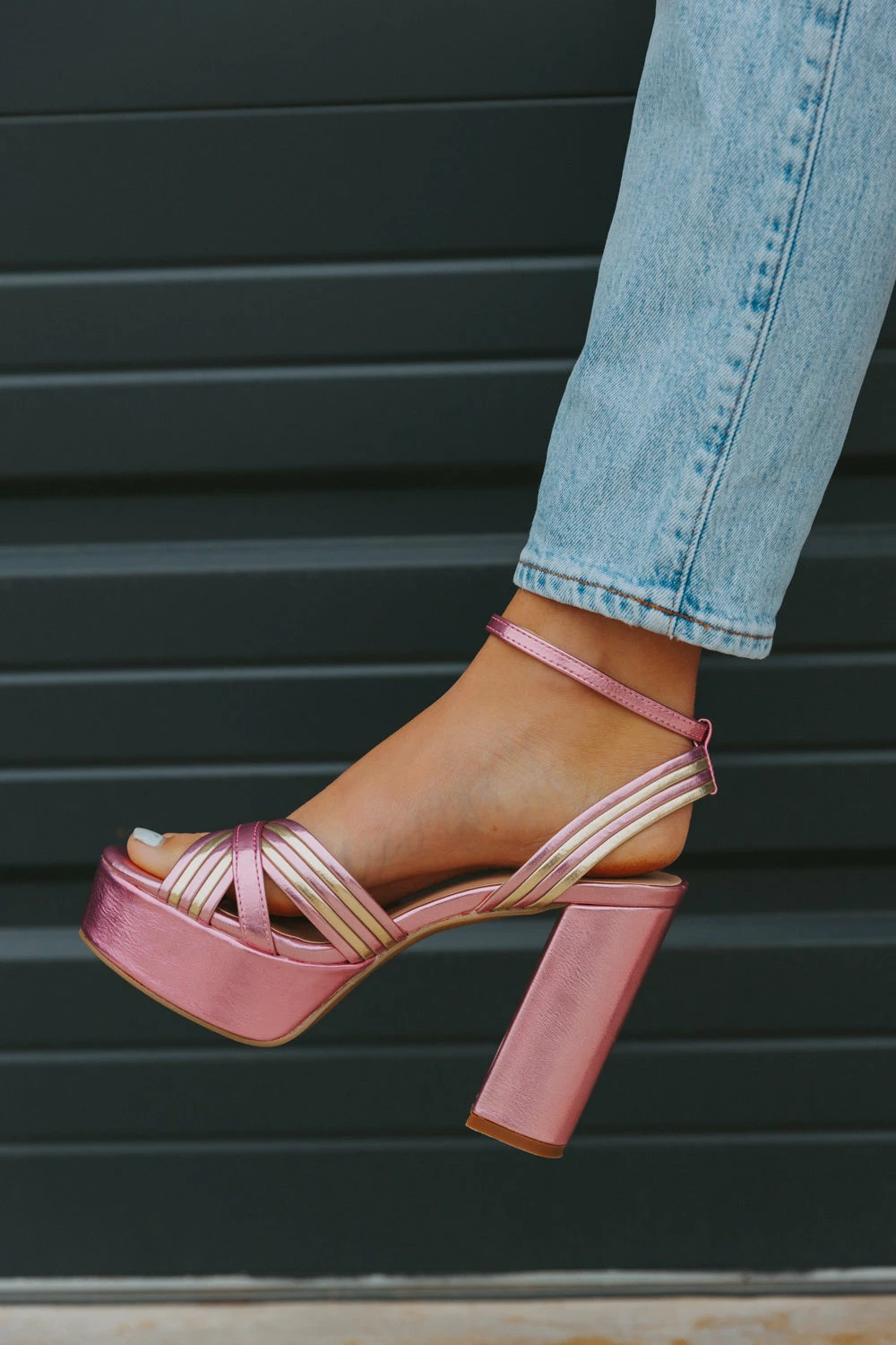 Our Eloisa HeelsΒ are made from faux metallic leather with a towering platform sole, chunky heel and a delicate, yet sturdy ankle strap. Style yours with your favorite BuddyLove mini dress.