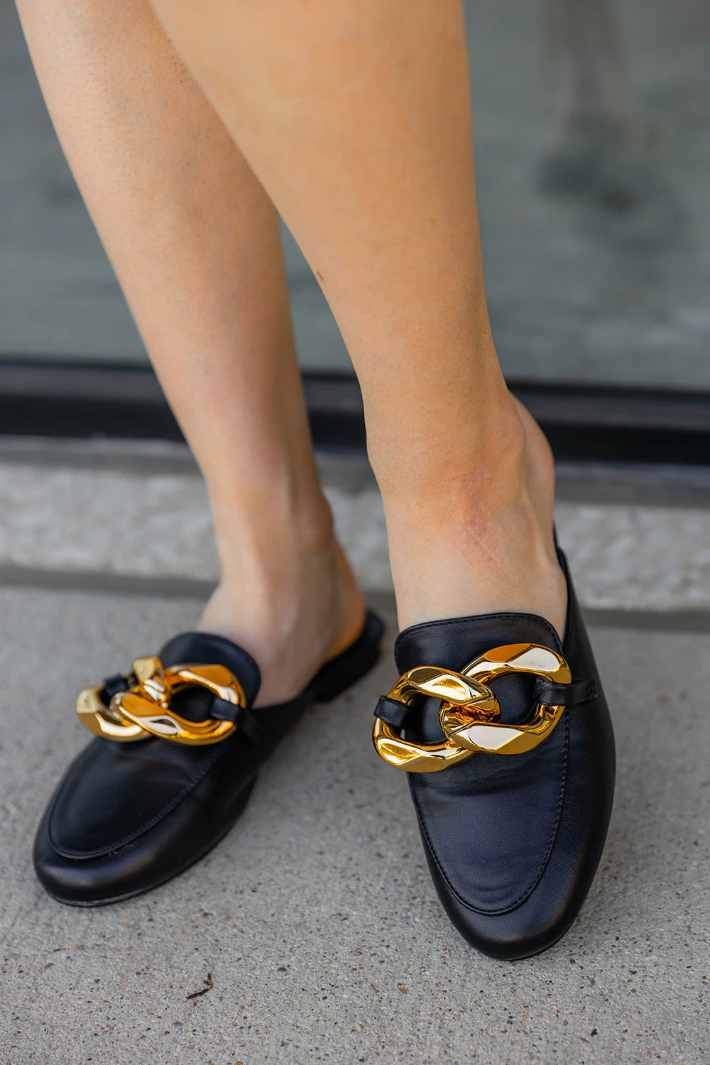 The Emily Mule is sure to be a closet staple this fall. The gold chain adds the perfect accent to the shoe. These mules can transition effortlessly from day to night- Pair her with a blazer for the office or a dress for a night out on the town!