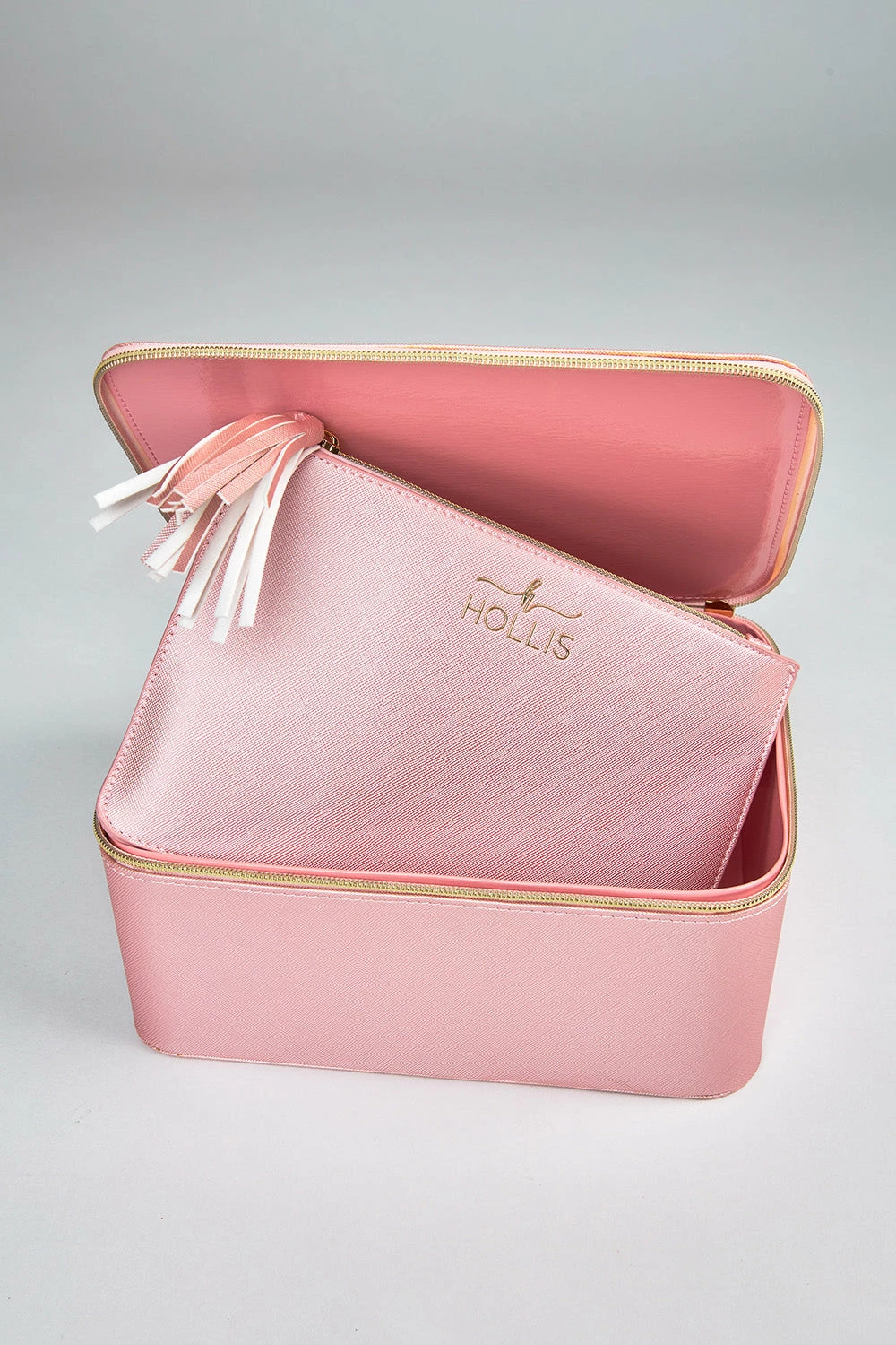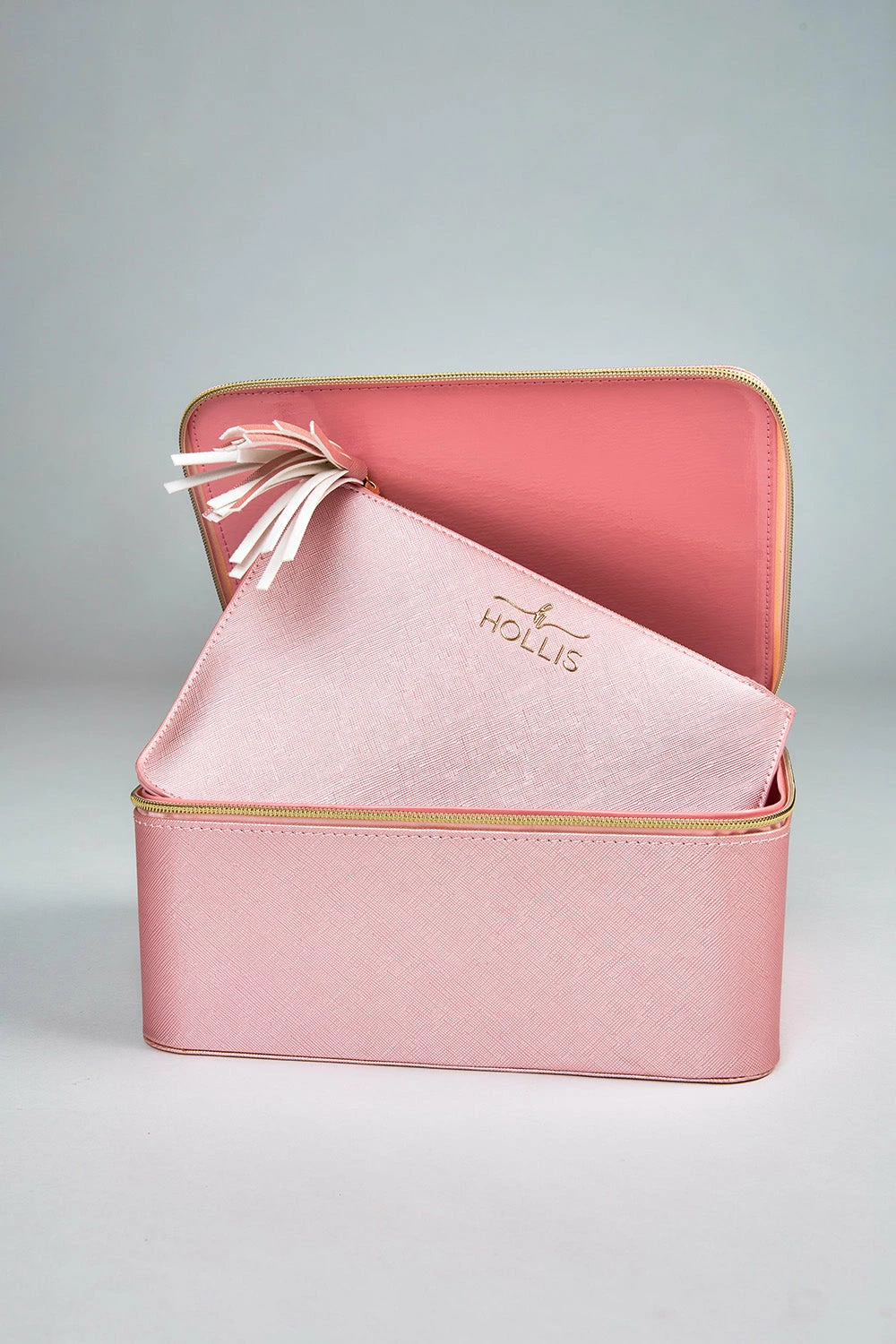 The holy grail make up bag! This one is for my make up junkies! The Jett Setter is a beautiful blush leather that comes lined with a unique interior that can easily be wiped out with a make up wipe and will never stain! No more throwing out your make up bag when you have a spill. This bag is perfect for travel and even comes with a pouch to hold your make up brushes and smaller items.