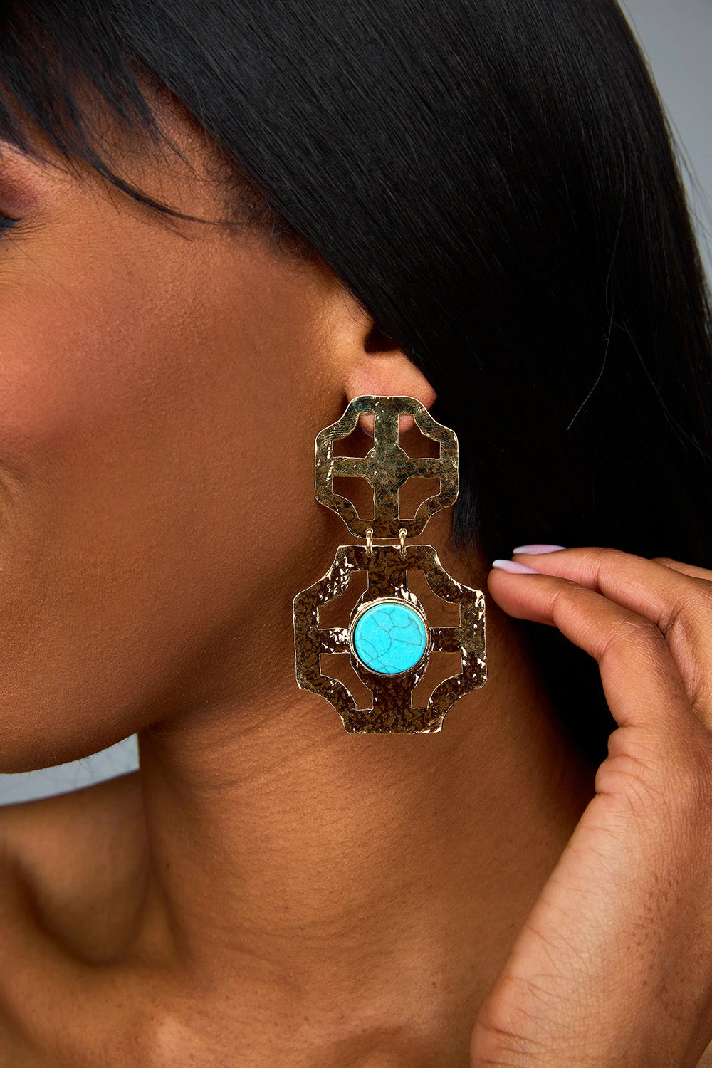 With a lightweight design and gold-plated finish, these earrings are perfect for everyday wear. The turquoise stones add a touch of color to any outfit. Chic and simple, these hoops are a must-have for any jewelry lover.